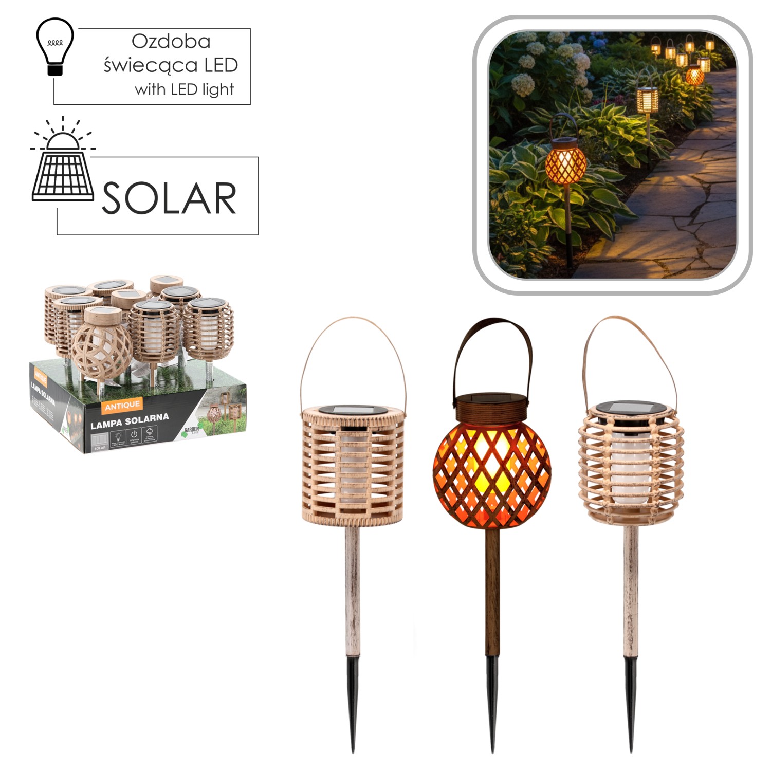Солнечная светодиодная лампа. Идеально подходит для сада. Ее можно установить в любом месте, где есть достаточное количество солнечного света. Солнечные лампы наиболее эффектно смотрятся, установленные вдоль дорожек, аллей, подъездных путей, на террасах или верандах. Они подчеркивают и дополняют архитектуру сада, в том числе пруды или растительные композиции. Лампы питаются от солнечной энергии, поэтому не требуют дополнительных финансовых затрат.• Линия продукта: Garden Line• Размеры продукта: 125 x 125 x 355 мм• Солнечная батарея: аморфный кремний 39 x 39 мм• Емкость батареи: 100 мАч Ni MH с возможностью зарядки• Среднее напряжение: 1 x 1,2 В• Батарея AAA• Тип лампочки: 12 x белый теплый светодиод с эффектом пламени• Основной материал изделия: пластик• Основной цвет продукта: античный • Степень защиты продукта: IP44• Устойчивость к атмосферным воздействиям.• Крепится к земле с помощью специального пластикового штифта • Устойчивость к атмосферным воздействиям.• Крепится к земле с помощью специального пластикового штифта • Дисплей: 9 штук