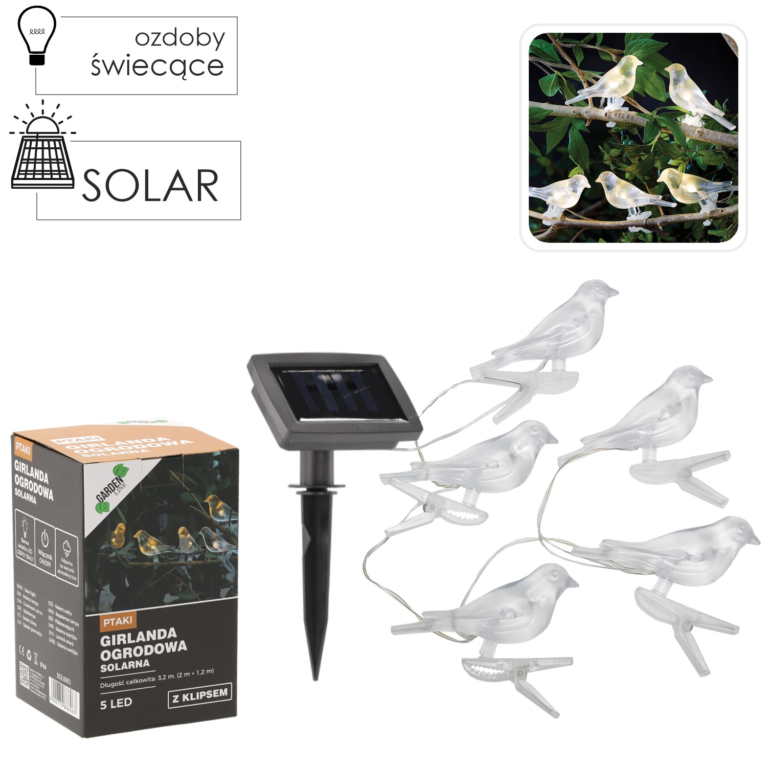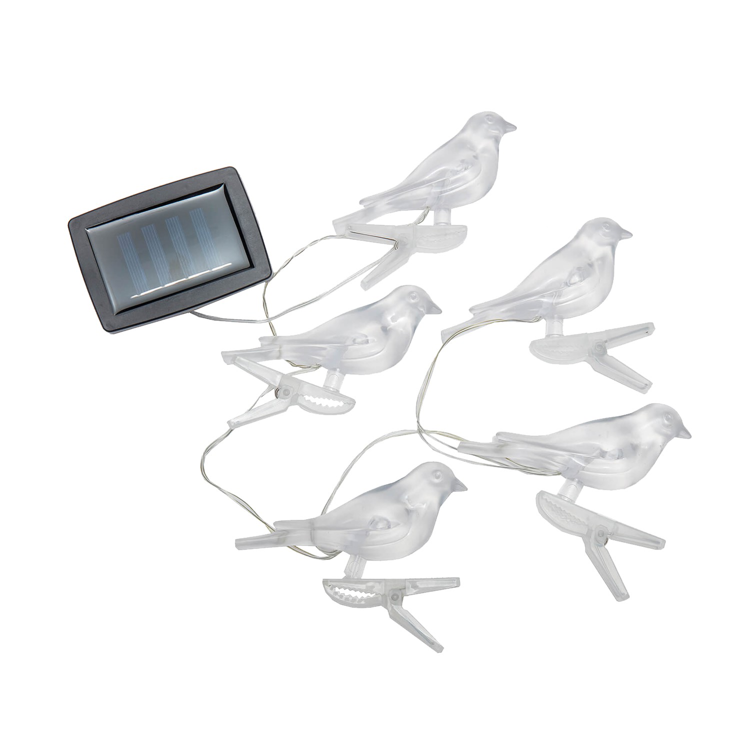 Солнечная гирлянда для сада с птицами и зажимами - 2 + 1,2 м, 5 светодиодов, теплый белый свет