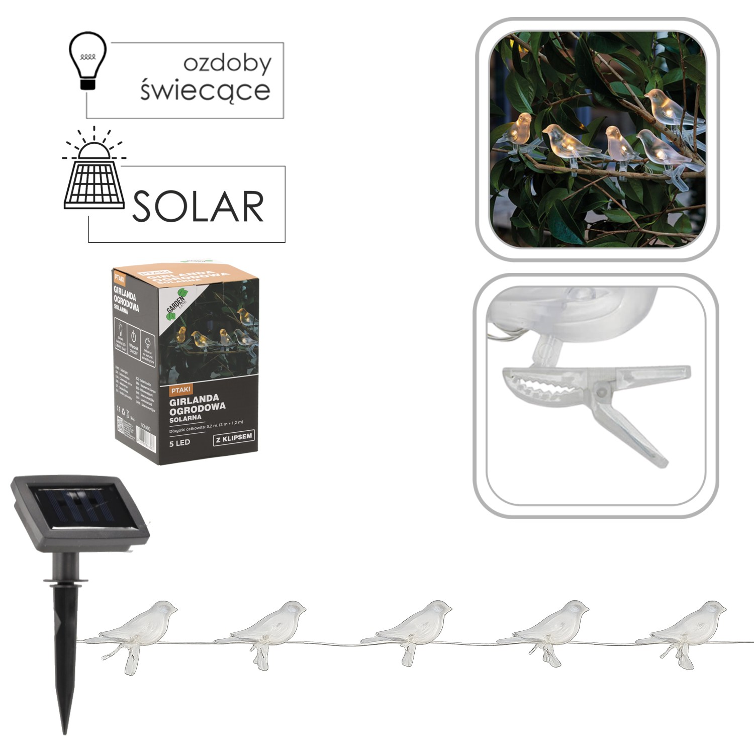 5 штукГирлянда с птицами на солнечных батареях с зажимамиТеплые белые светодиодыПитающий кабель: 2 мРасстояние между лампочками: 30 смРежим работы: постоянное свечение или миганиеВнутри 1 шт. перезаряжаемая батарея NI-MH 1,2 В AA 400 мАчПоликристаллический солнечный панель; IP44Общая длина: около 2 м + 1,2 м = 3,2 мВремя зарядки: 7–8 часовВремя работы: 6–7 часов