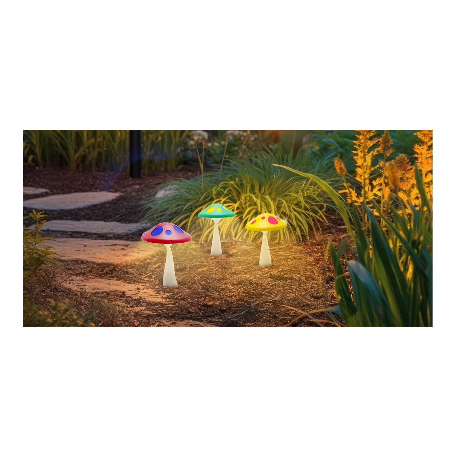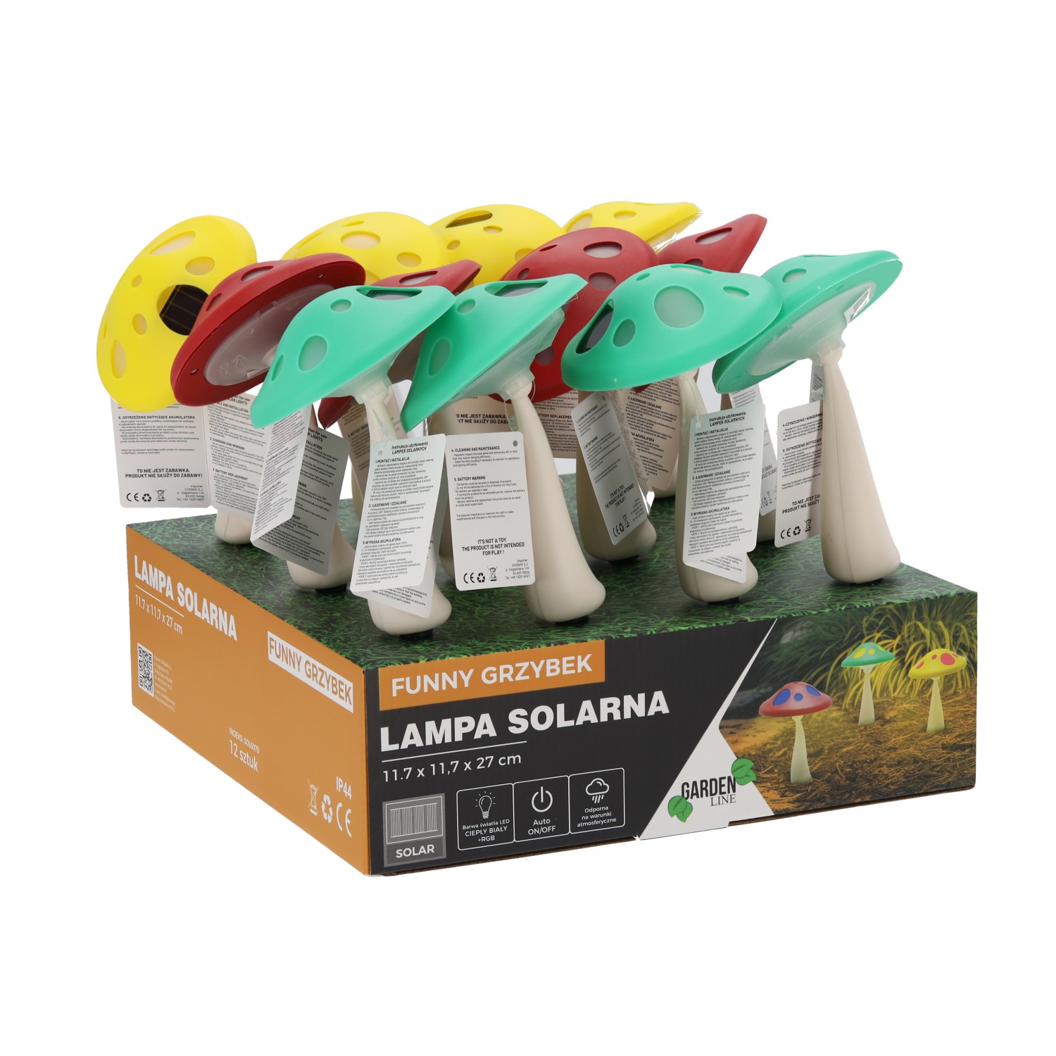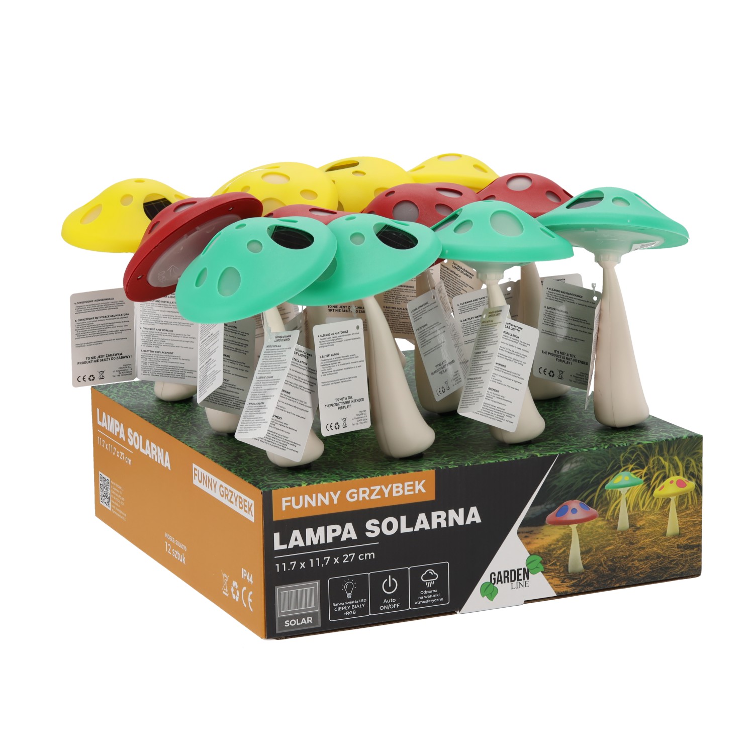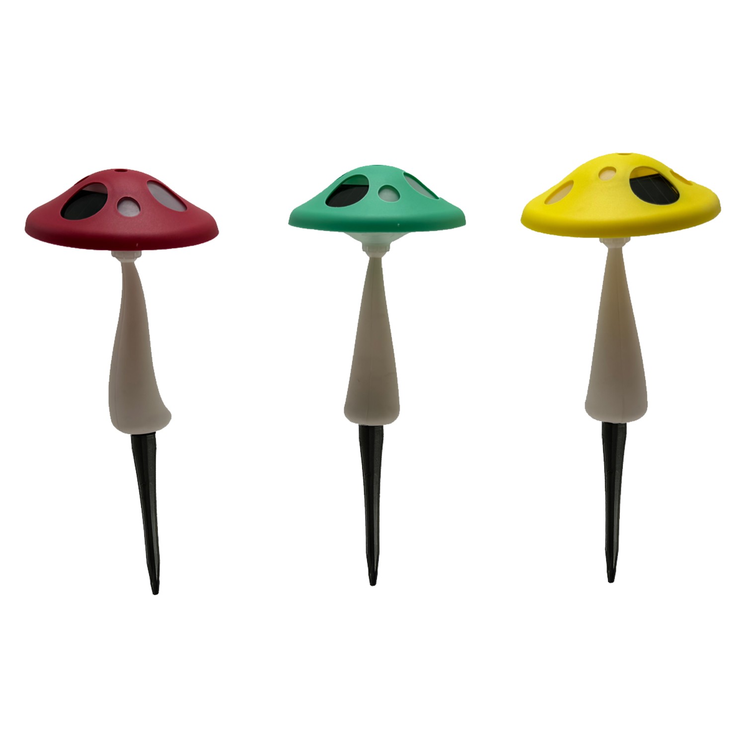 Солнечные грибовидные фонари на столбеЦвет продукта: красный, зеленый или желтыйРазмер изделия: 11,5 x 11,5 x 27 см1 белый светодиод + 1 RGB светодиодВнутри 1 шт. батарея AA NI-MH 200 мАчВремя зарядки: 7-8 часовВремя работы: 6-7 часов