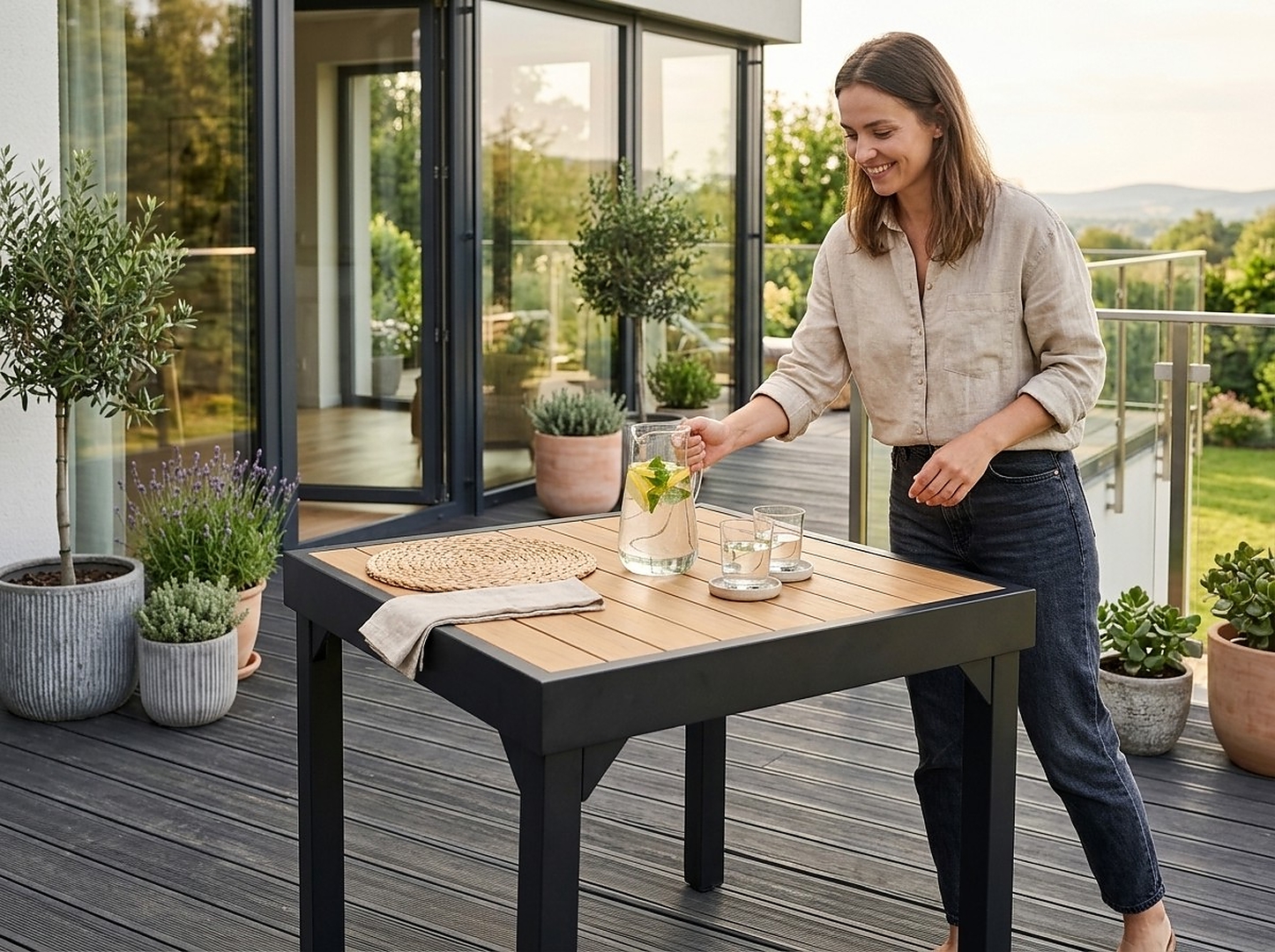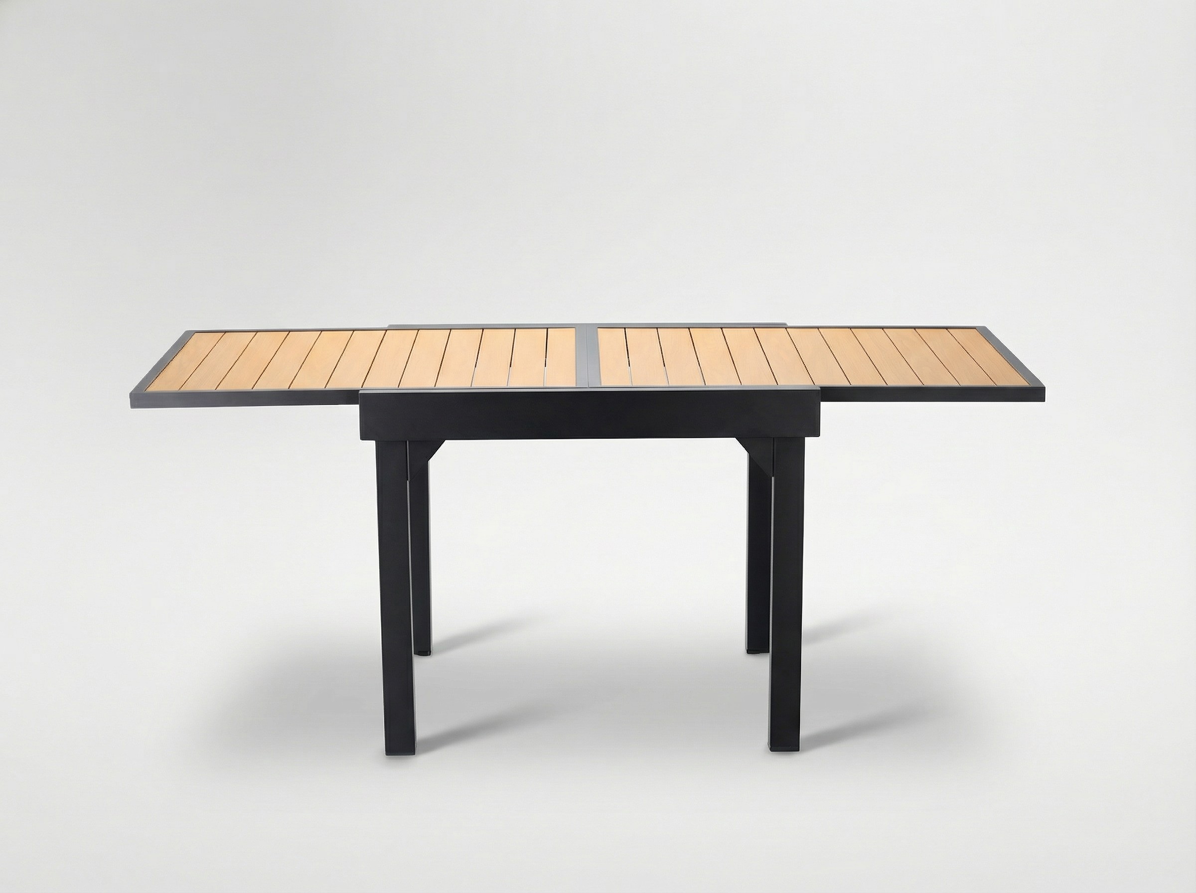 ✅ Прочная алюминиевая рама с порошковым покрытием гарантирует устойчивость к погодным условиям и коррозии, а столешница с термотрансферной печатью имитирует натуральное дерево, придавая конструкции элегантный и стильный вид.
