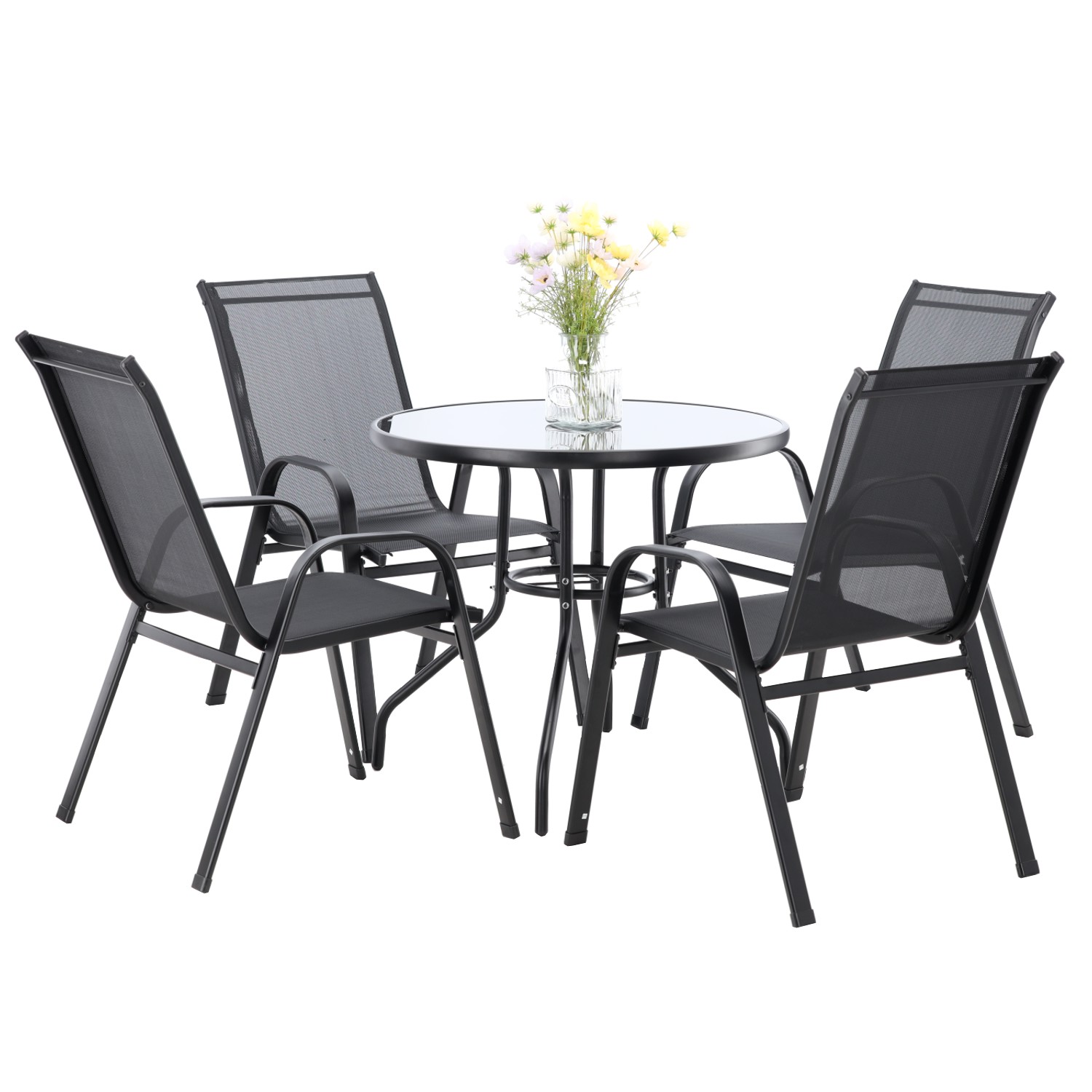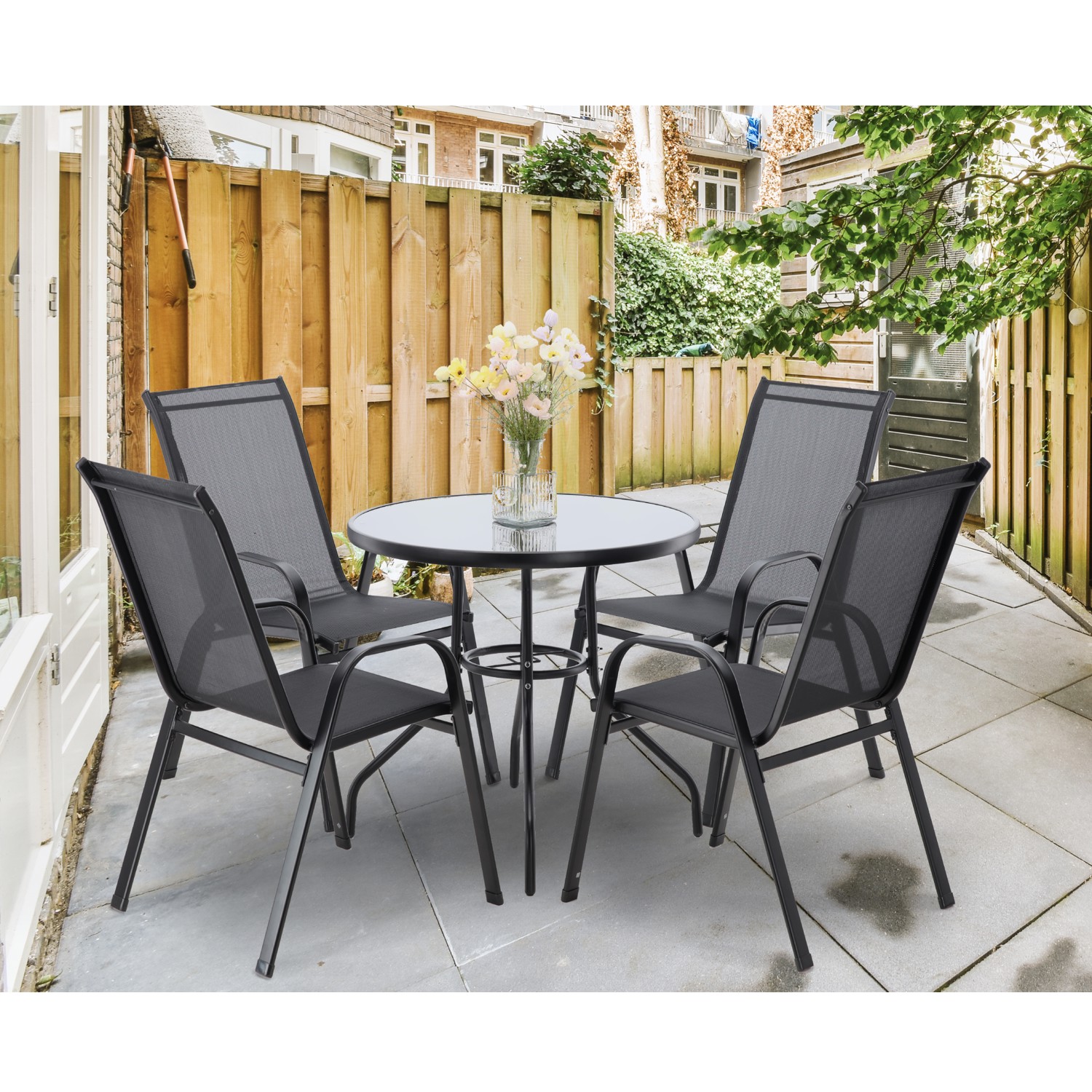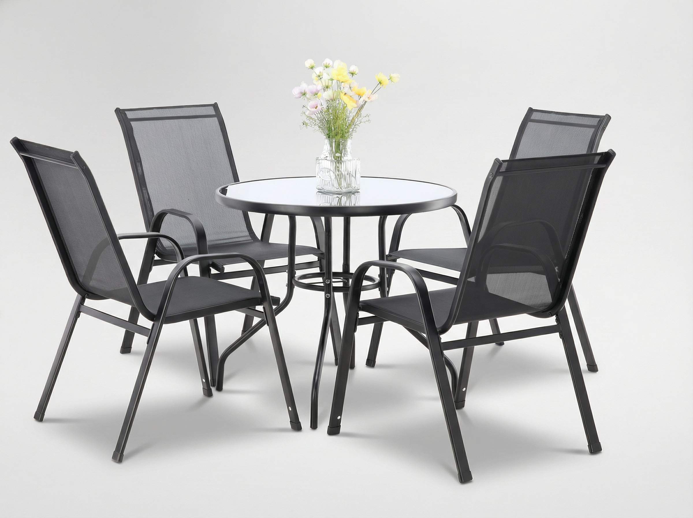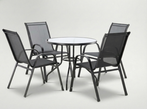 Набор садовой мебели черного цвета, состоящий из четырех удобных стульев и элегантного круглого столика со стеклянной столешницей. Благодаря прочной конструкции и долговечным материалам набор отлично подойдет для сада, балкона или террасы. Современный дизайн и удобство использования делают его идеальным выбором для летнего сезона.
