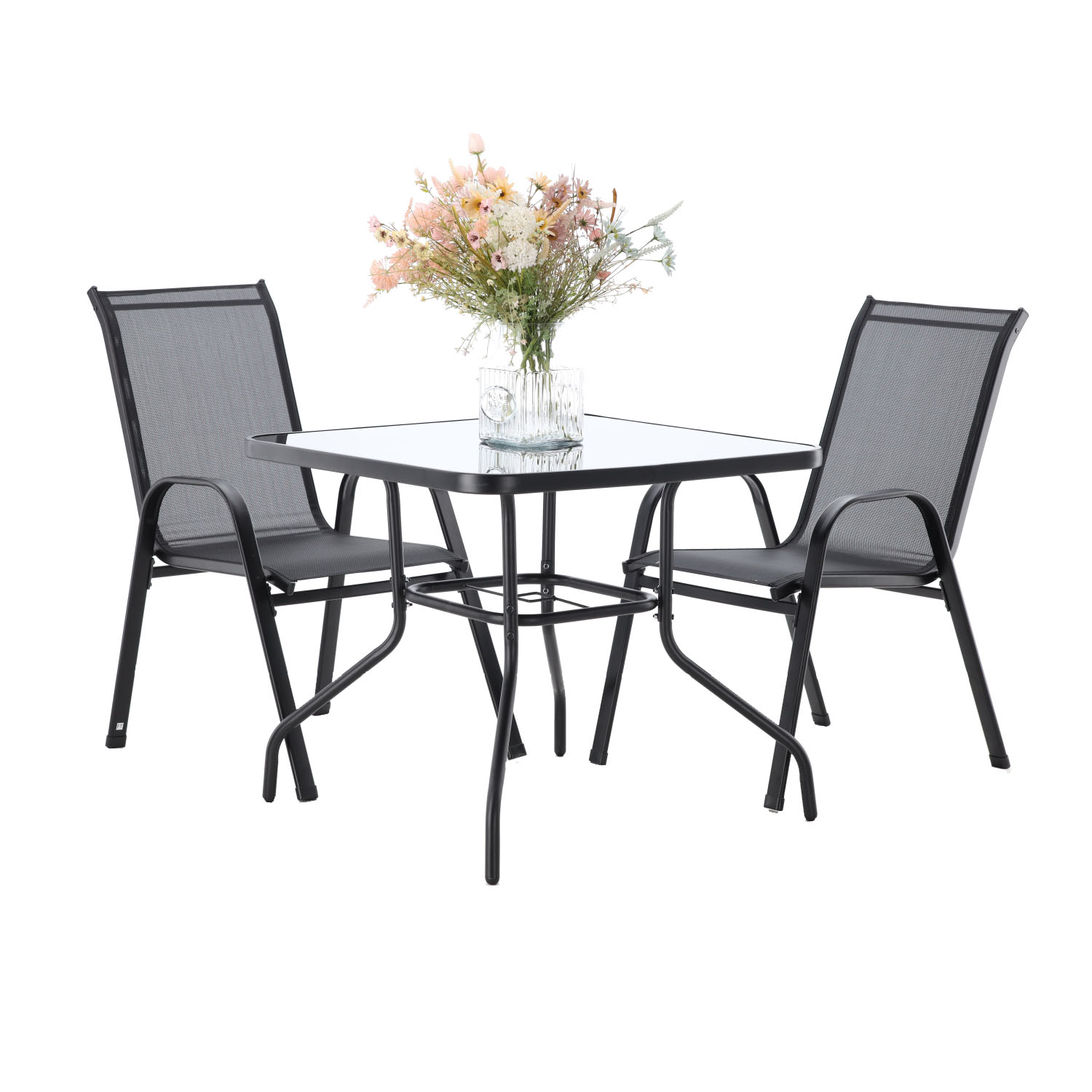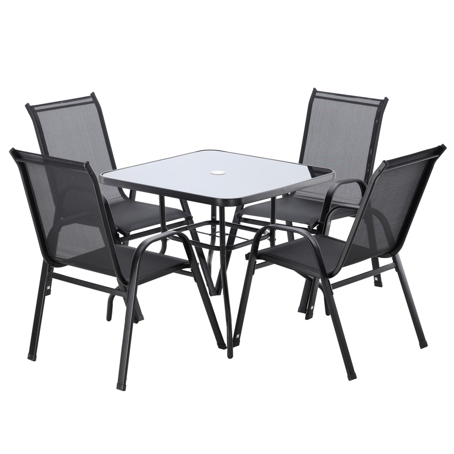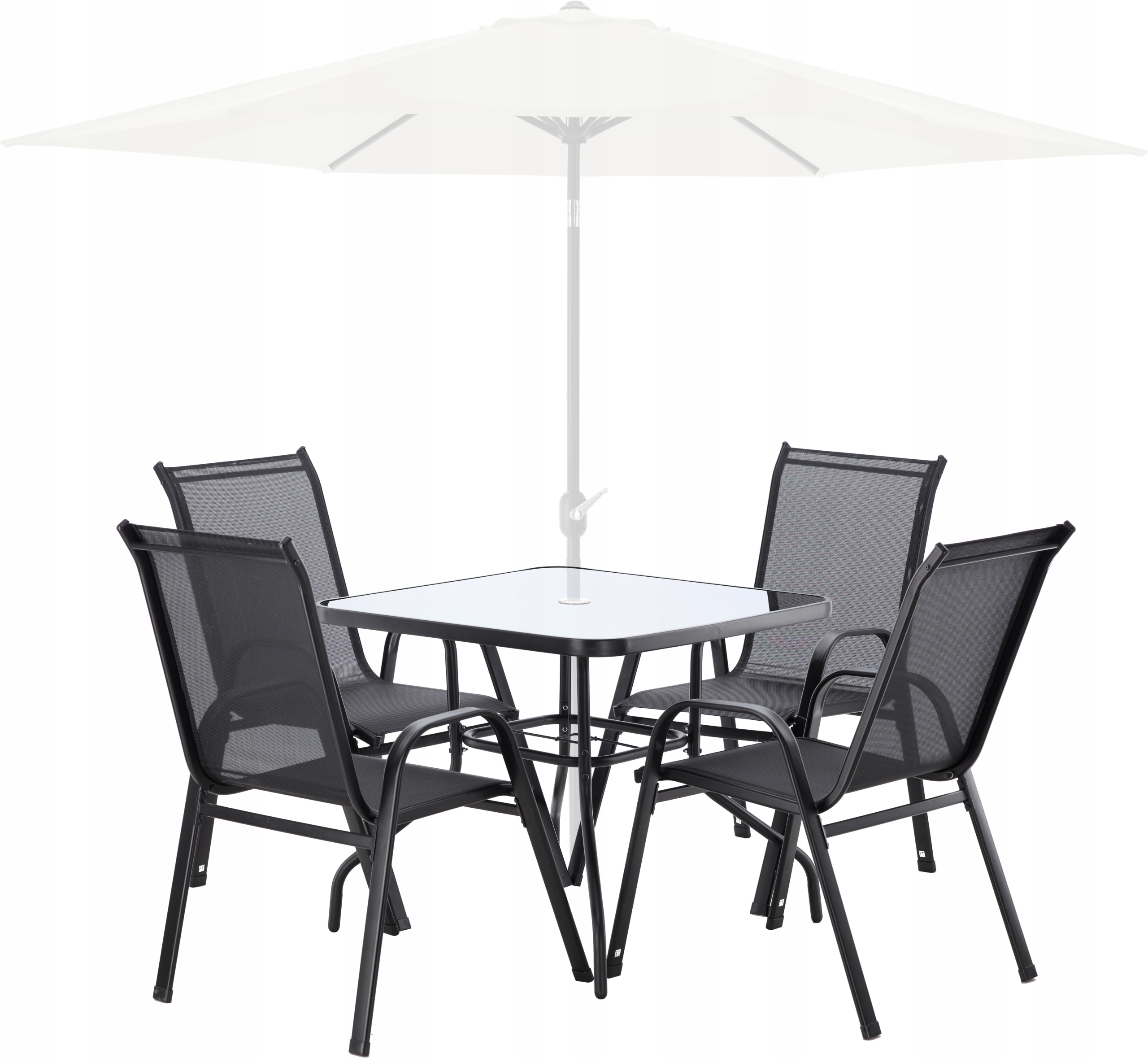 Современный комплект садовой мебели черного цвета, состоящий из четырех удобных стульев и квадратного столика со стеклянной столешницей. Прочная конструкция из окрашенной порошковой краской стали и устойчивые к атмосферным воздействиям материалы делают этот комплект идеальным для сада, террасы или балкона. Комфорт использования и элегантный внешний вид гарантируют долгое удовольствие от использования.