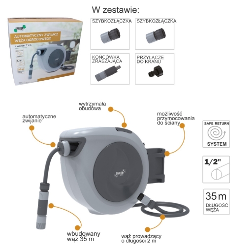 Шланг изготовлен из ПВХ, что делает его прочным и устойчивым к различным погодным условиям. Его внутренний диаметр составляет 11 мм, а внешний — 15 мм, что позволяет эффективно и результативно поливать растения. Барабан оснащен распылителем и быстроразъемным соединением, что позволяет легко подсоединять и отсоединять шланг.