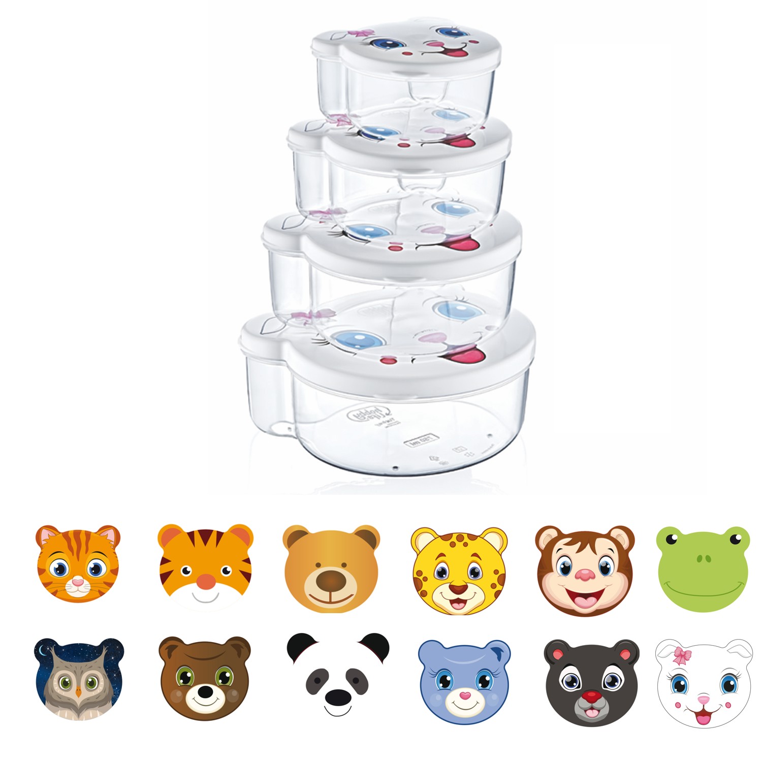 Этот продукт изготовлен из высококачественного пластика. Цветные крышки с изображениями животных станут идеальной упаковкой для школьного завтрака вашего ребенка. Контейнеры имеют разные размеры, что позволяет хранить в них различные виды продуктов. Обеспечивают оптимальную защиту от неприятных запахов, которые исходят от продуктов с интенсивным ароматом, таких как сыр. Ваша еда остается свежей в два раза дольше.Благодаря герметичной крышке контейнеры идеально подходят для путешествий. Большим преимуществом продукта является возможность выбора дизайна крышки по вкусу покупателя, а также разнообразие размеров контейнеров.
