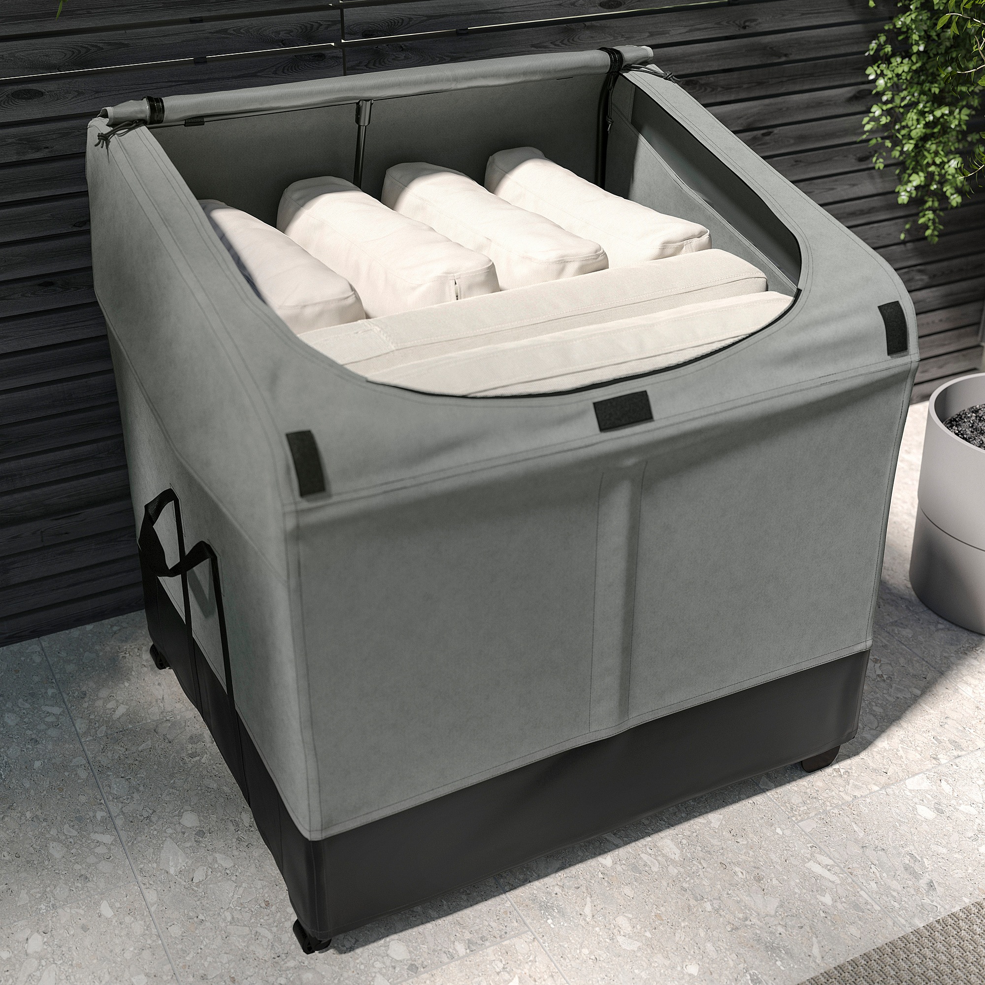 Вне сезона храните контейнеры с подушками в прохладном месте в закрытом помещении.
