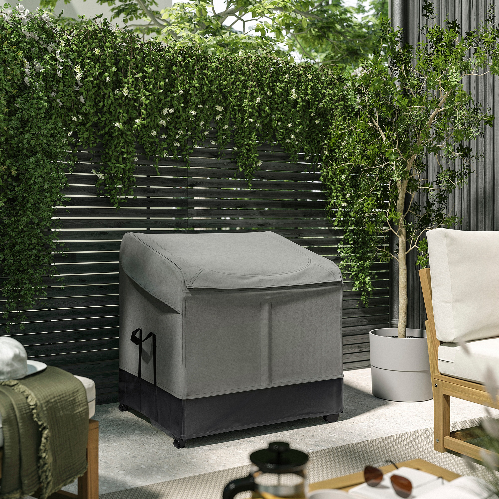 Контейнер для хранения VÄTTERSÖ, предназначенный для использования на открытом воздухе, имеет два вентиляционных отверстия, которые обеспечивают циркуляцию воздуха и предотвращают скопление влаги внутри контейнера.