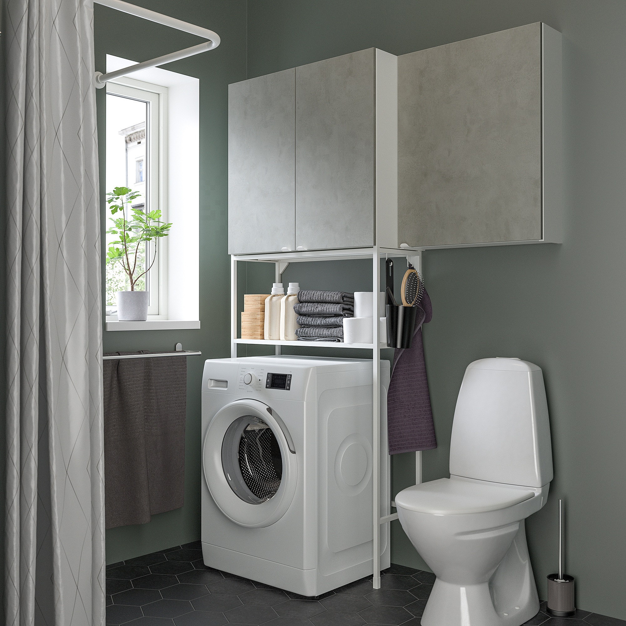 Поместите крючки ENHET на раму, чтобы повесить полотенца, или освободите место для хранения с помощью корзин СКАТТОН.