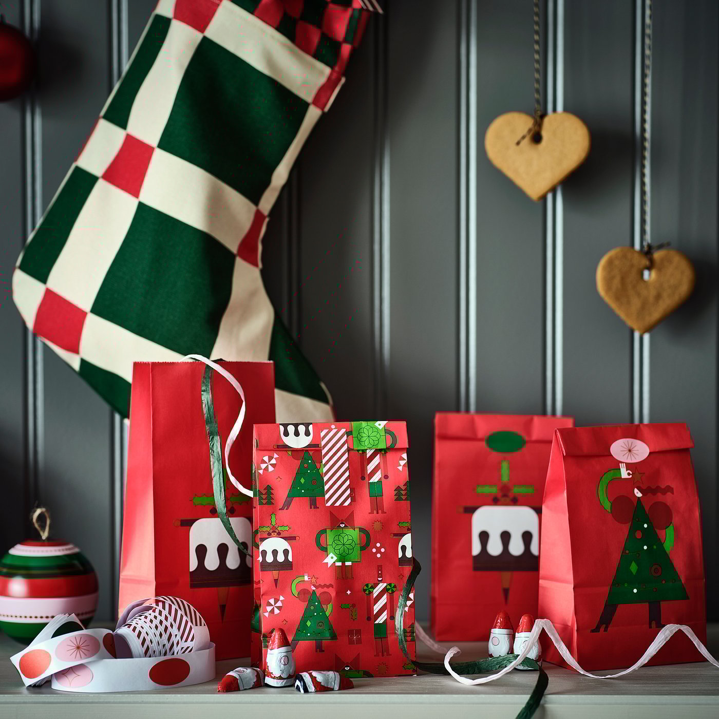Упакуйте праздничные подарки в кратчайшие сроки. Набор содержит 12 пакетов с красным узором, которые помогут вам превратить небольшие, изготовленные вручную сувениры и лакомства в уникальные подарки.