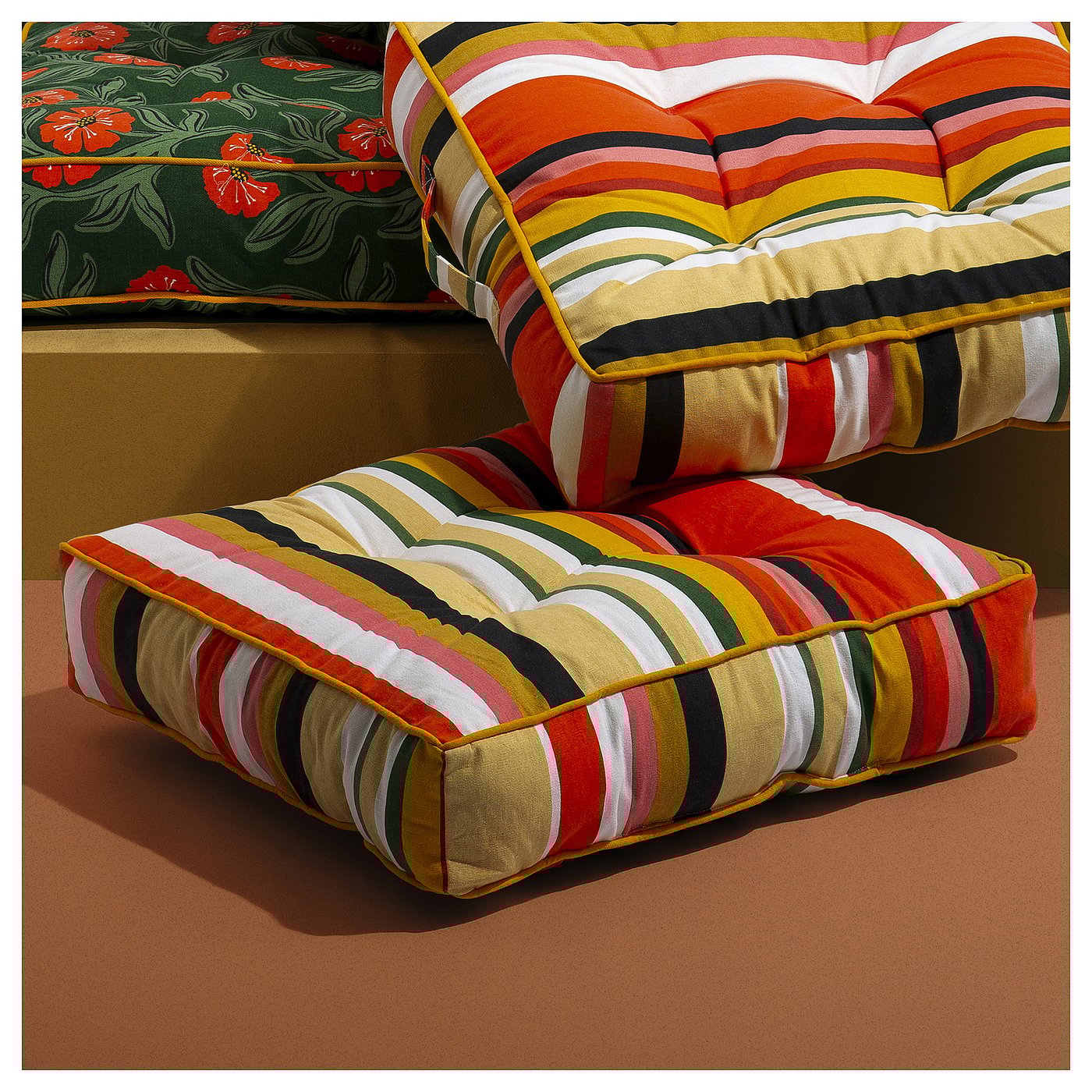 Подушка для пола идеально подходит в качестве дополнительного места для сидения. Она имеет цветные полоски с каждой стороны и украшена желтой окантовкой. Ручки облегчают перенос.