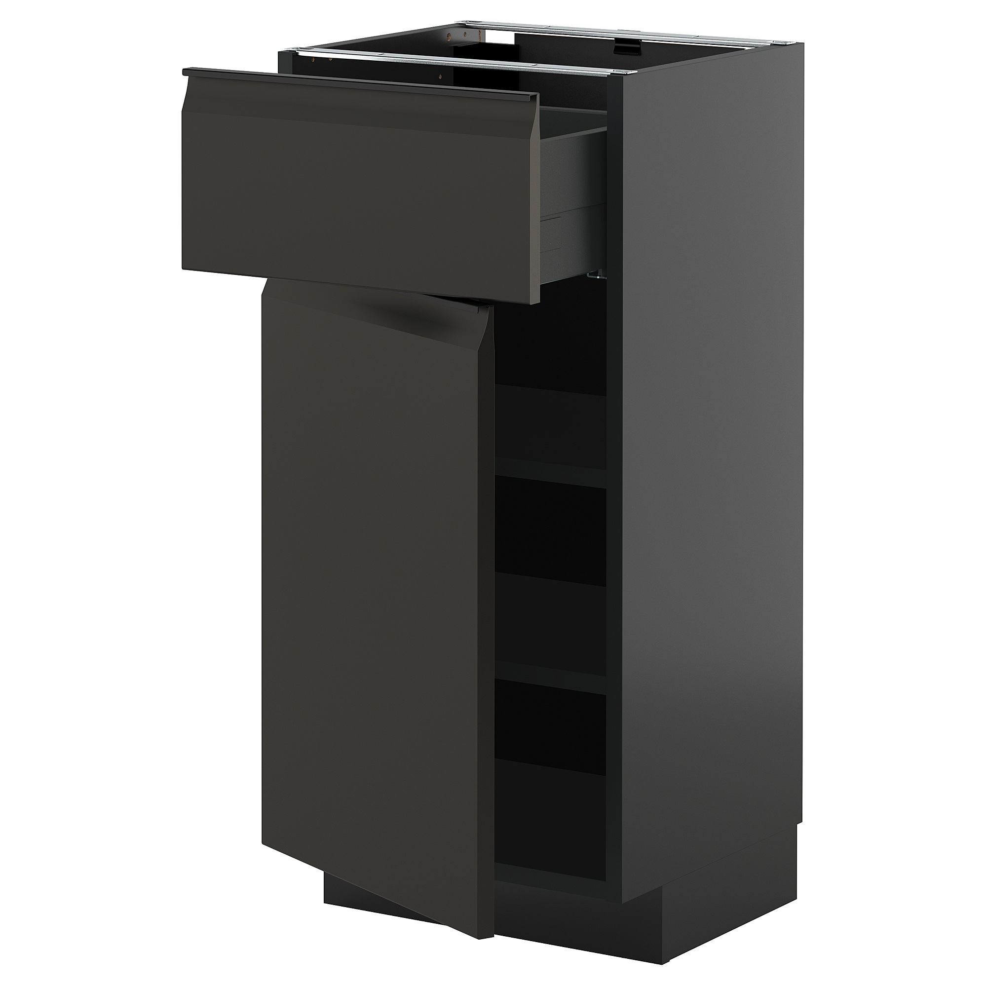 Система METOD предоставляет неограниченные возможности для проектирования кухни вашей мечты. В сочетании с фасадами UPPLÖV в матовом черном цвете с интегрированной ручкой и скошенными краями вы получите современный графический характер.