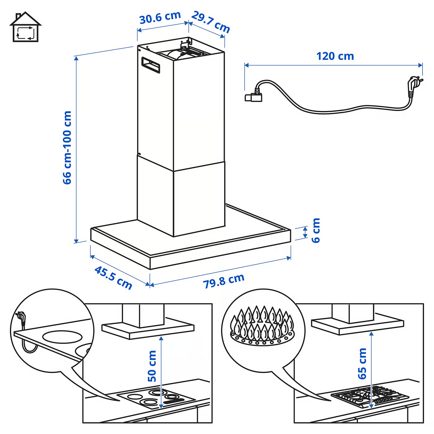 Ширина: 79.8 смГлубина: 45.5 смВысота: 6.0 смМинимальная высота в режиме вытяжки: 66.0 смМаксимальная высота в режиме вытяжки: 90.0 смМинимальная высота в режиме циркуляции: 66.0 смМаксимальная высота в режиме циркуляции: 100.0 смШирина дымохода: 30.6 смГлубина дымохода: 29.7 смДлина кабеля: 1.8 мВес: 15.50 кгМощность двигателя: 26 Вт
