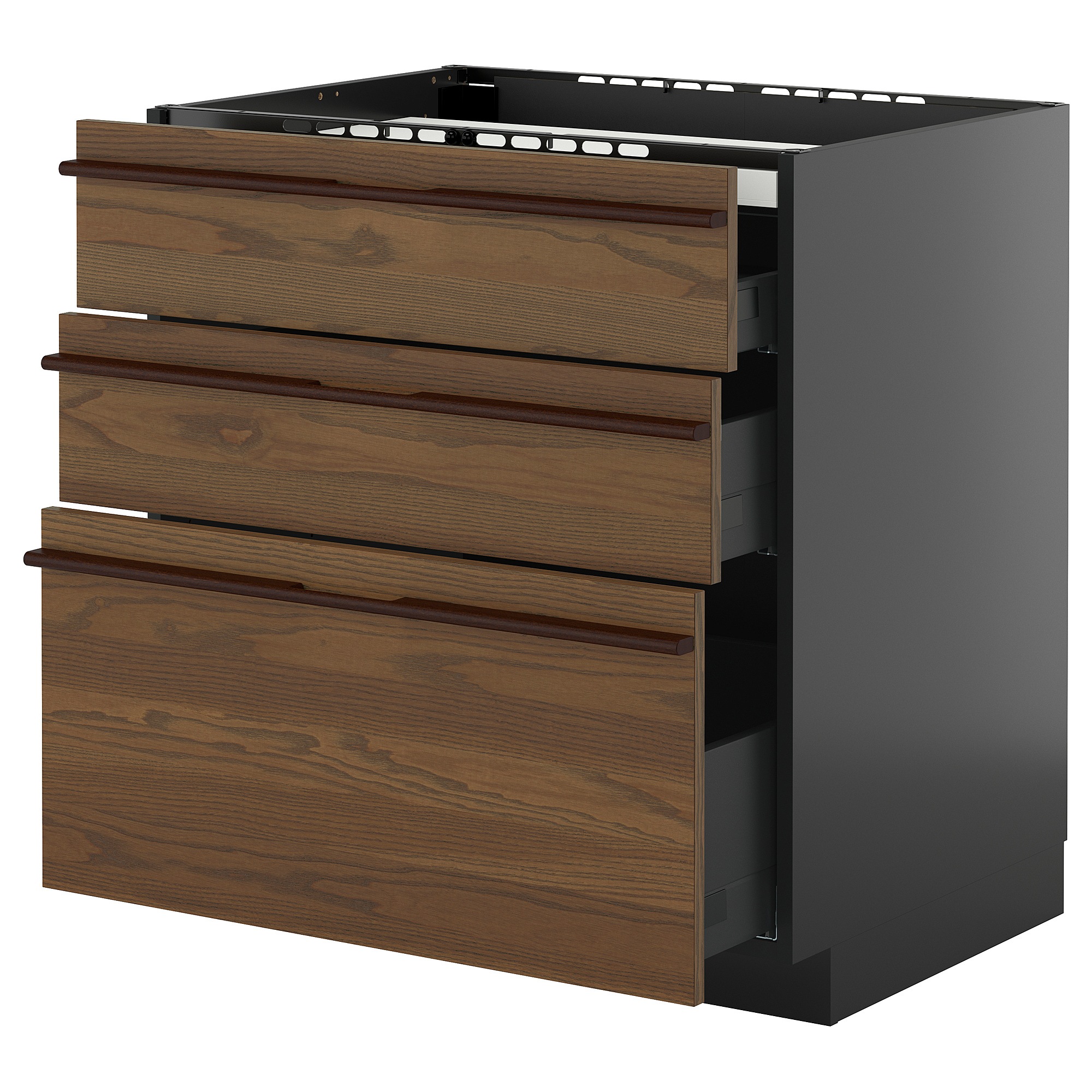 Система METOD предоставляет неограниченные возможности для проектирования кухни вашей мечты. В сочетании с фасадами STENSTA из пропитанного темно-коричневого шпона и ручками из массива дерева создается теплый, интересный эффект.