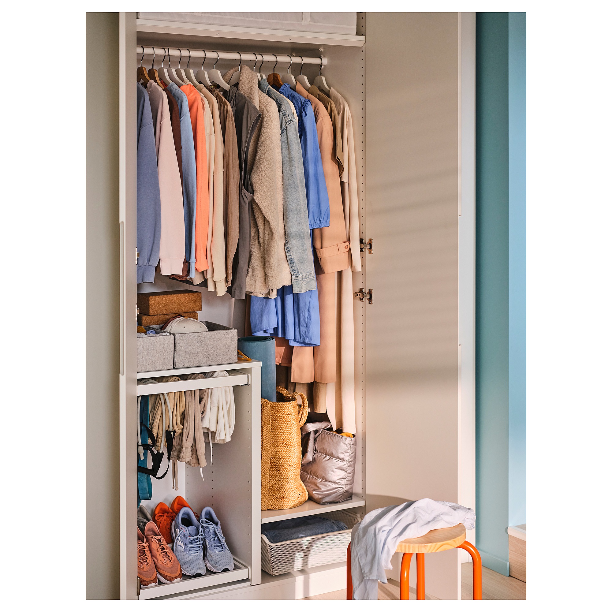 Мечтаете о красивой гардеробной для своей спальни? Предлагаем решение для вас. Начните с корпусов, а затем добавьте серию KOMPLEMENT для хранения всей одежды, обуви и аксессуаров. В завершение персонализируйте ее, добавив двери по своему вкусу.