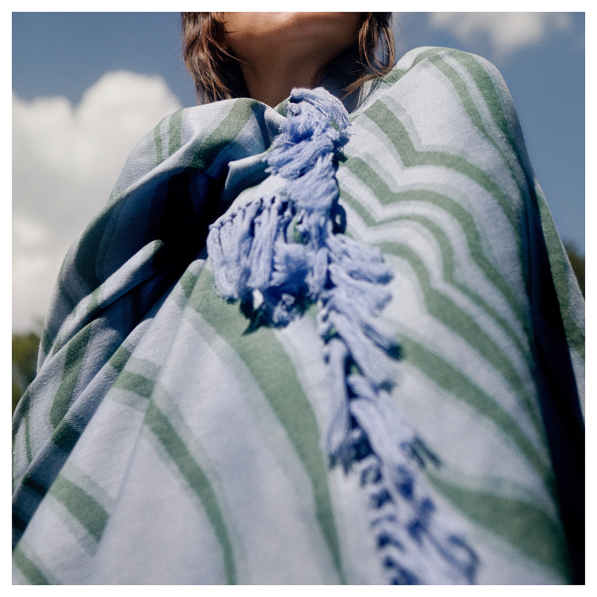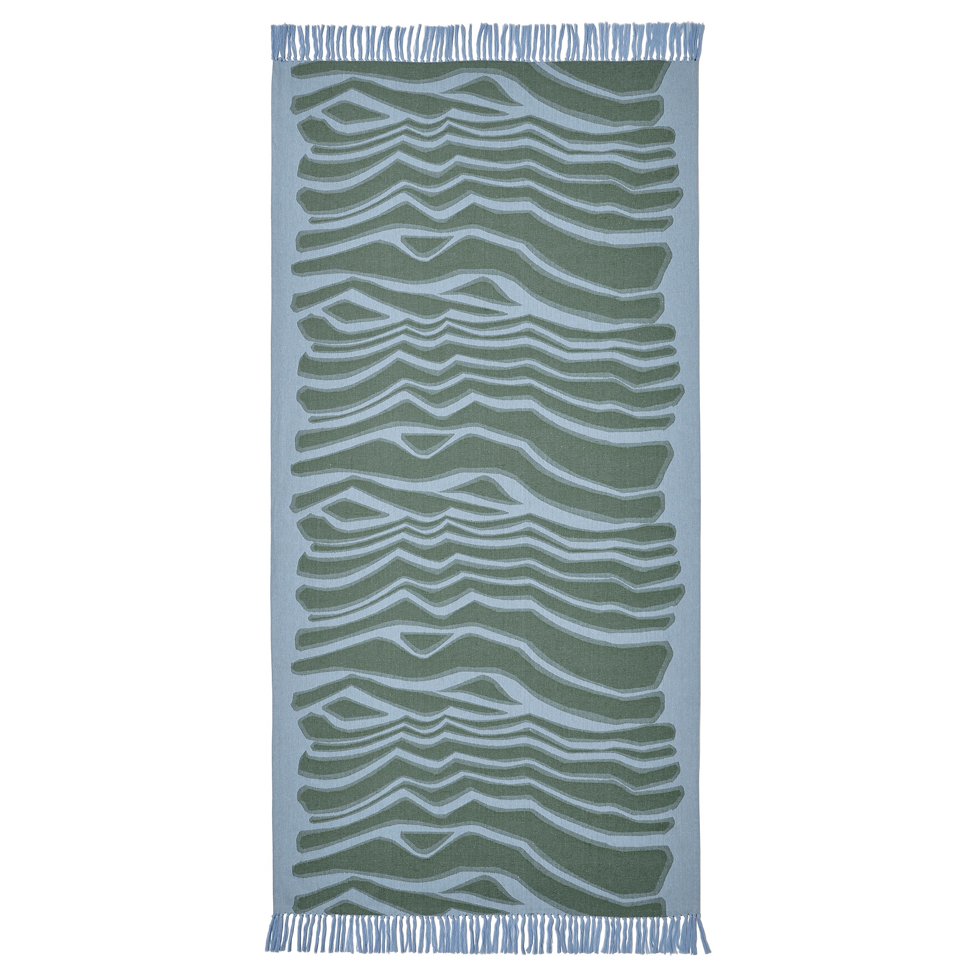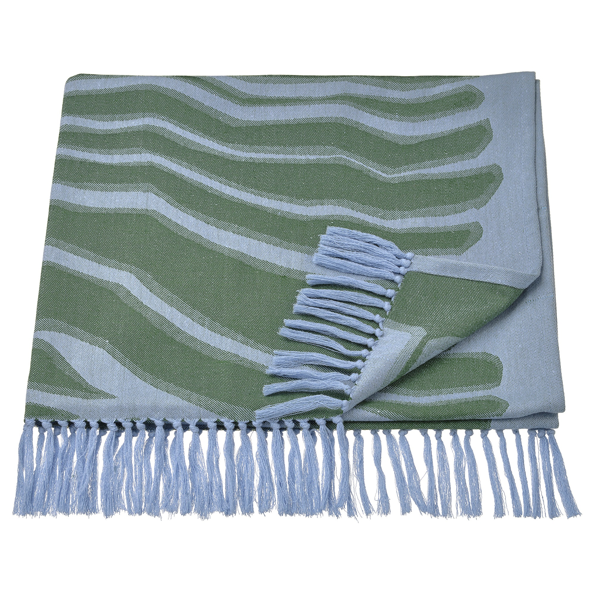 Позвольте себе побаловать себя! Это сине-зеленое банное полотенце с бахромой одинаково приятно, когда вы заворачиваетесь в него или кладете его в сауне или на пляже. Узор выполнен жаккардовым плетением с перевернутыми цветами с обеих сторон.