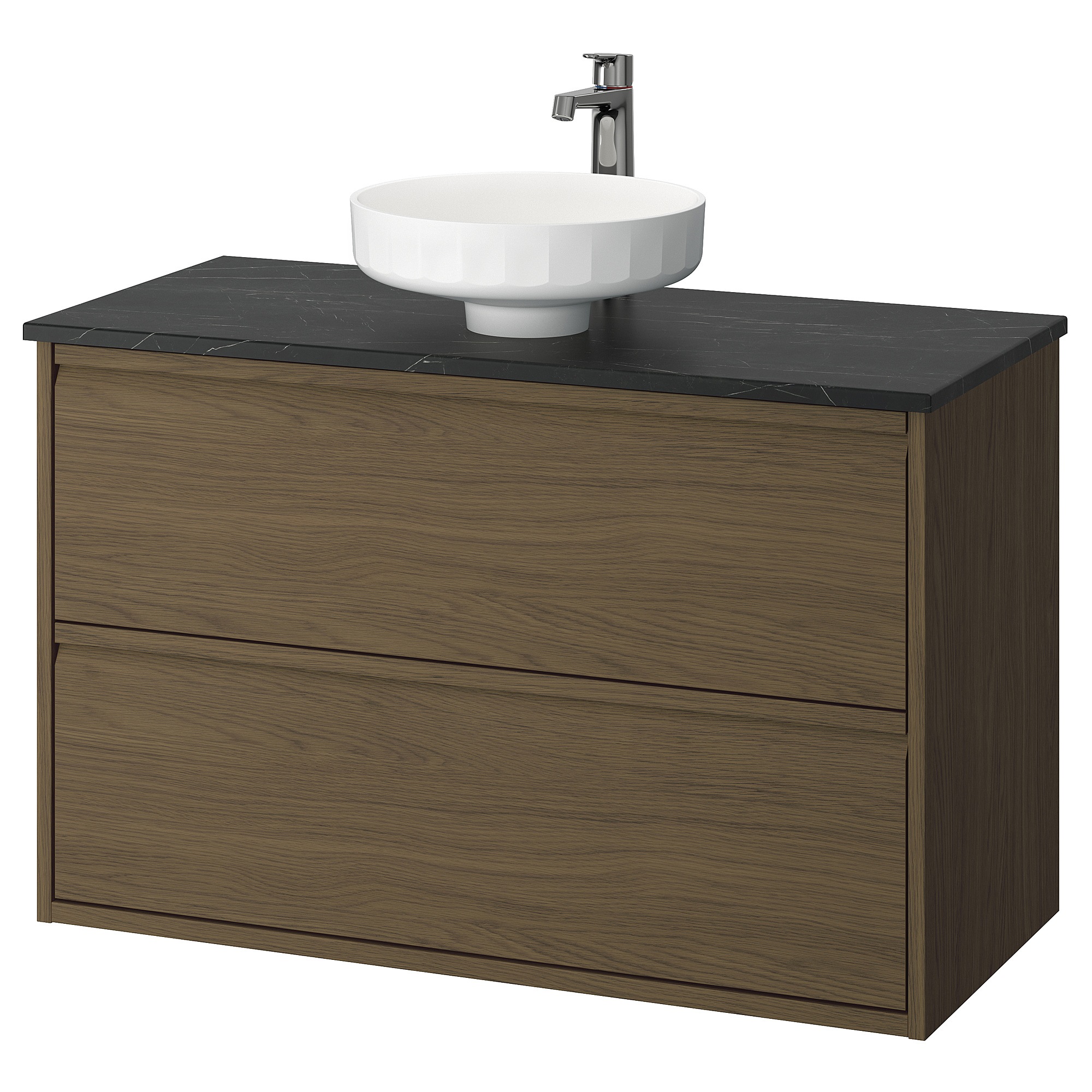 Мебель для ванной комнаты ÄNGSJÖN впечатляет современным дизайном и минималистичными деталями. Шкафчик под раковину в сочетании с столешницей и круглой настольной раковиной создает в ванной комнате стильный элемент с неповторимым характером.