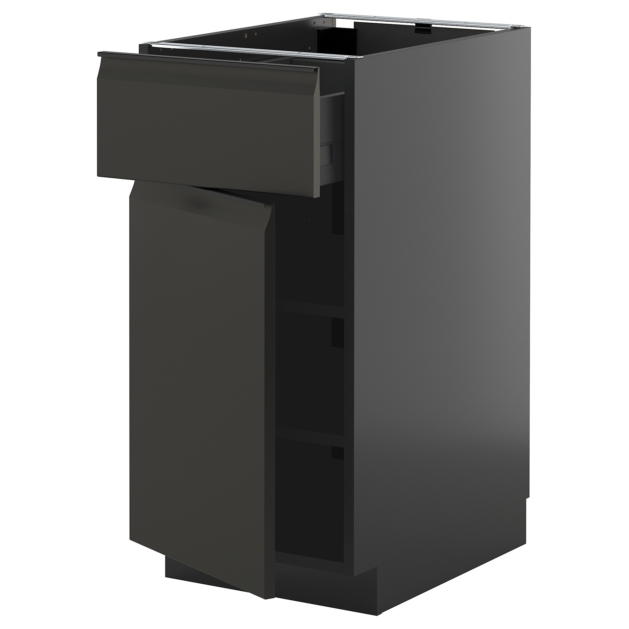Система METOD предоставляет неограниченные возможности для проектирования кухни вашей мечты. В сочетании с фасадами UPPLÖV в матовом черном цвете с интегрированной ручкой и скошенными краями вы получите современный графический характер.