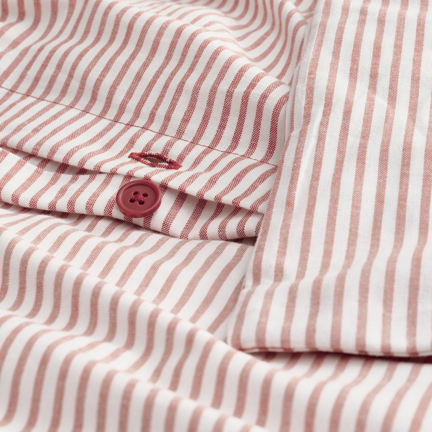 Постельное белье SOLFIBBLA изготовлено из мягкого 100% хлопка, а окрашенная пряжа создает классические красно-белые полосы. Более толстая пряжа создает в спальне уютную атмосферу с оттенком ремесленного очарования в винтажном стиле.