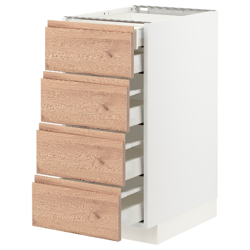 Система METOD предлагает неограниченные возможности для дизайна кухни вашей мечты. В сочетании с фасадами VOXTORP из имитации дуба со встроенными ручками вы получите естественный, теплый вид.