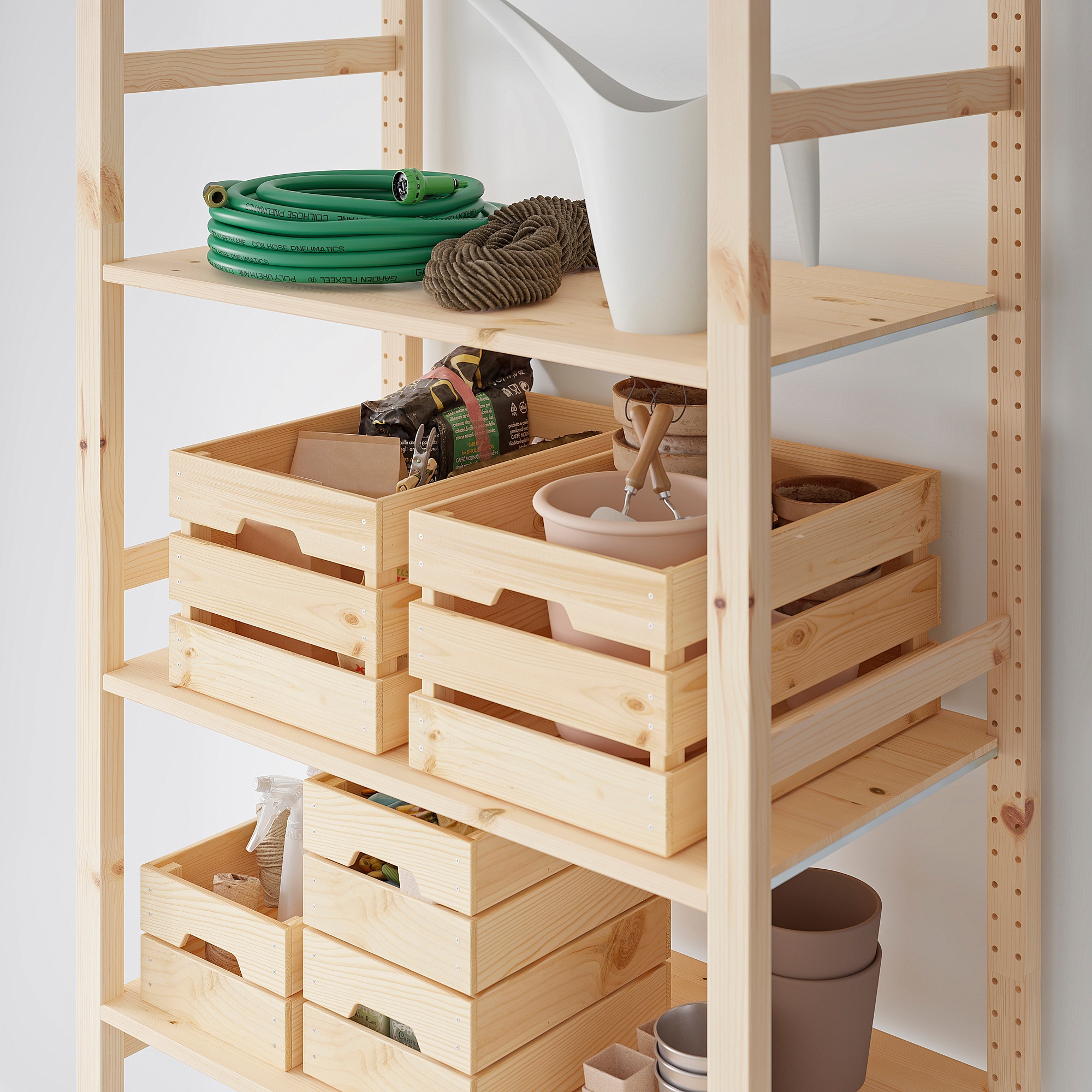 Прочный контейнер, который выдержит даже тяжелый груз. Можно оставить в первоначальном виде или обработать маслом, воском или краской вашего выбора. Прекрасно смотрится в гостиной или гараже и отлично сочетается с стеллажами IVAR.