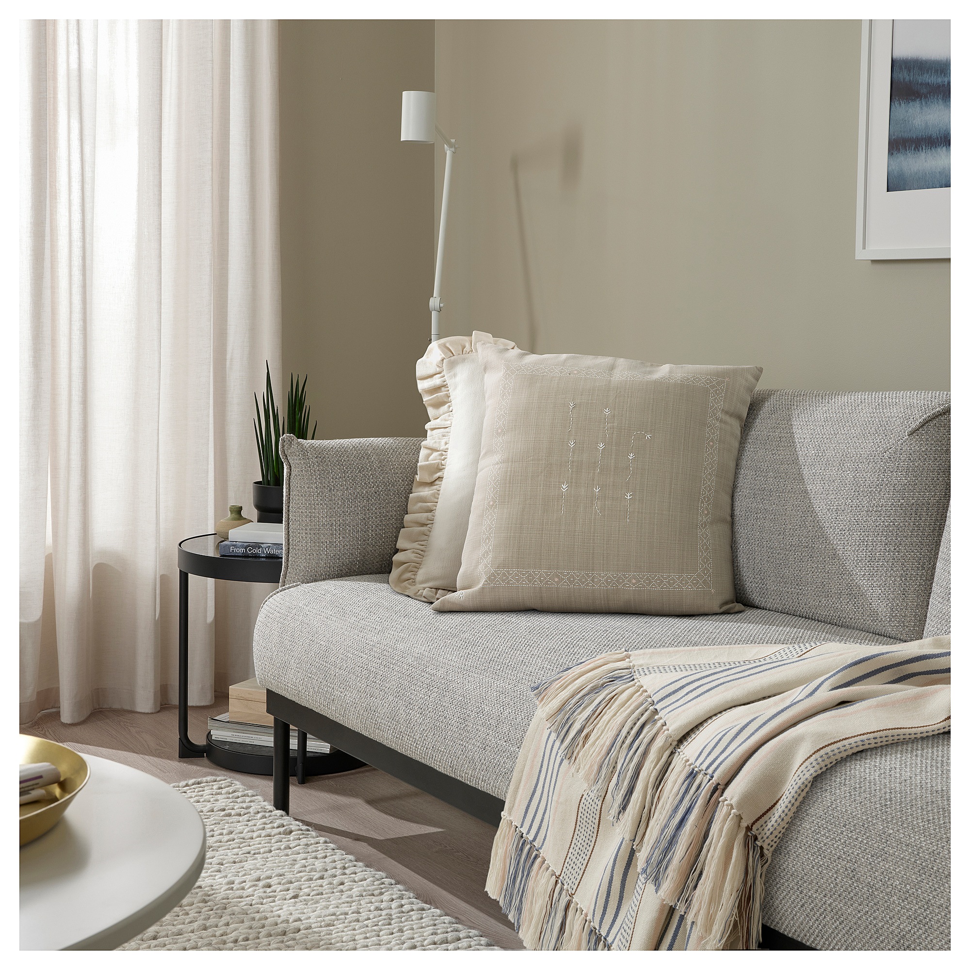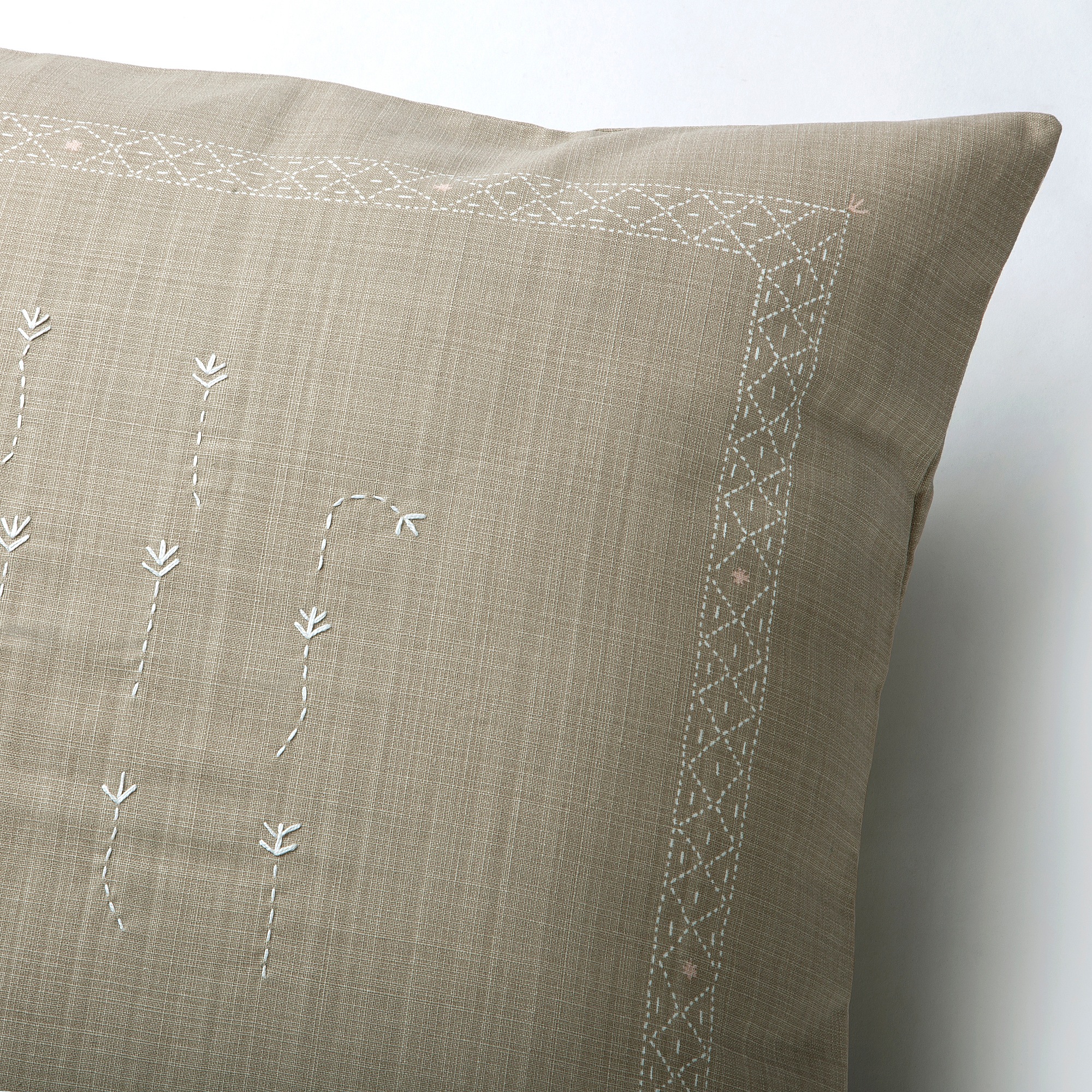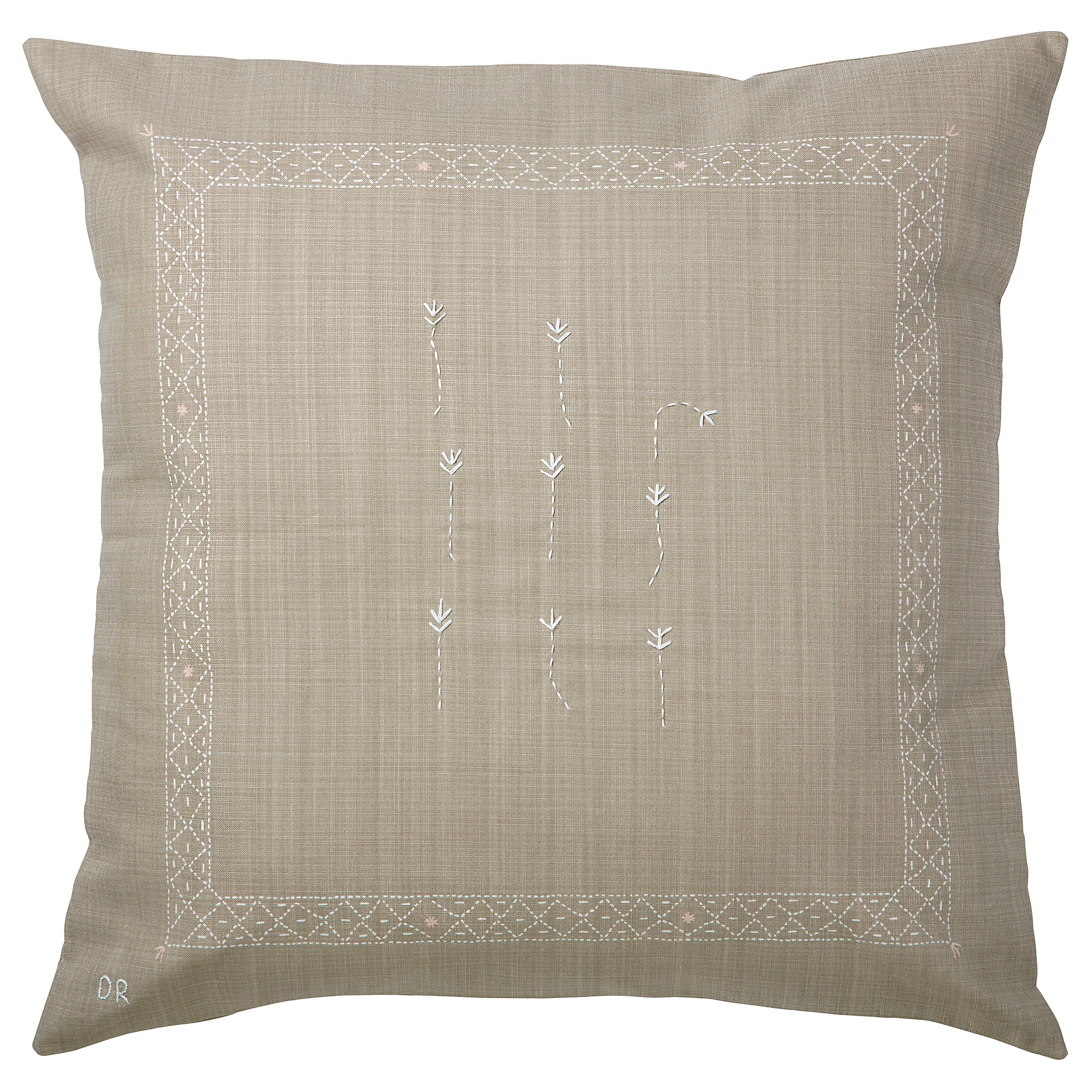 Декоративный чехол для подушки привлекает внимание и привносит нотку элегантности в гостиную. Набивной рисунок по краям служит красивым обрамлением для вышитых вручную цветов.