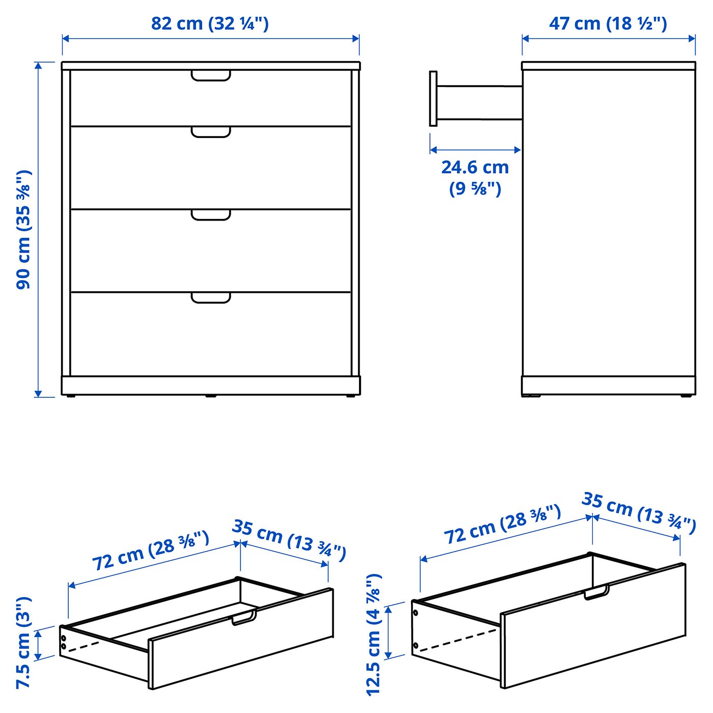 Глубина: 47 смГлубина ящика (внутренняя): 35 смВысота: 91 смШирина: 82 смШирина ящика (внутренняя): 72 смЕмкость хранения: 114 лВыдвижение ящика: 24.6 смЭтот продукт может потребовать сборки.