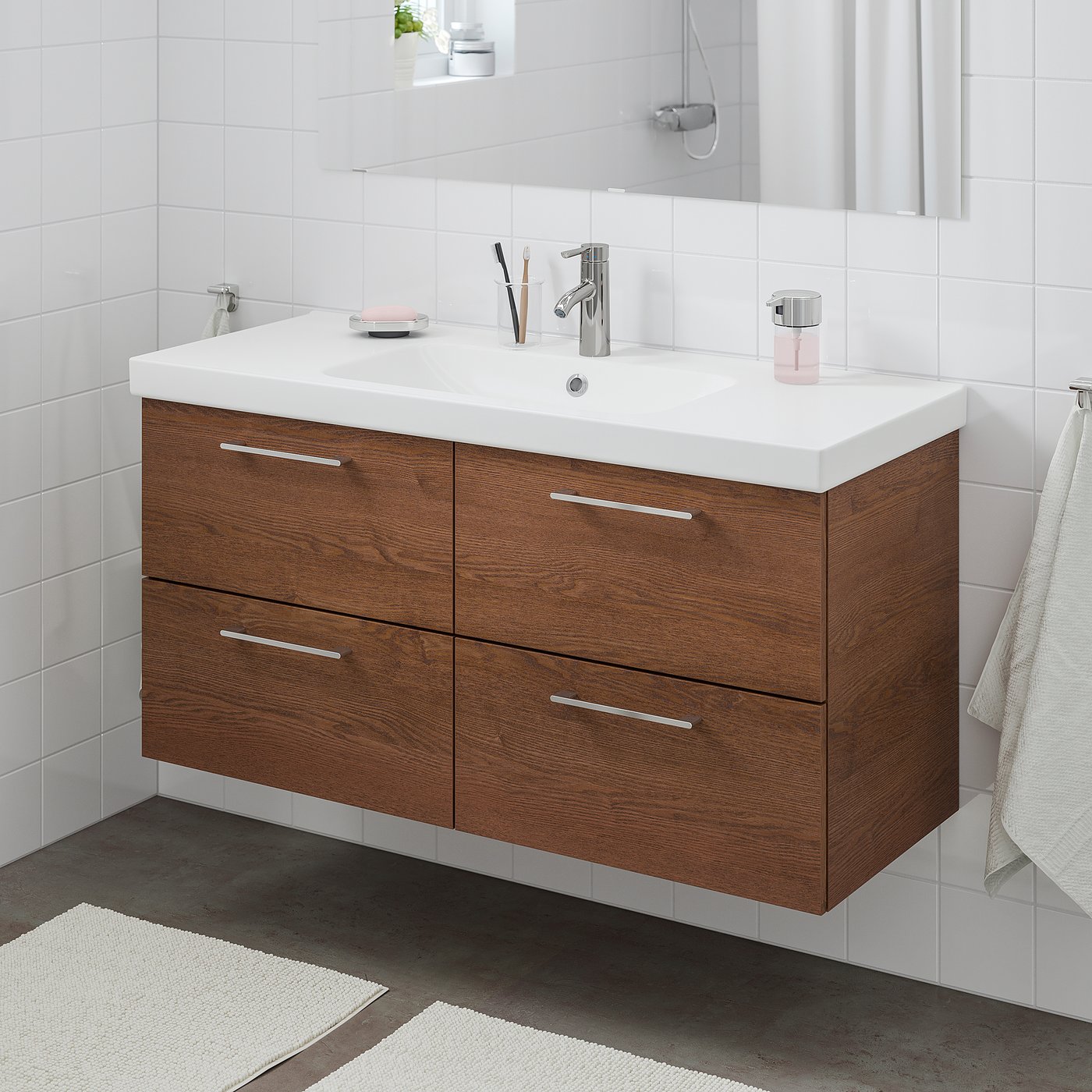 Смелый внешний вид с отделкой из темного дерева и видимым рисунком зерен. Это решение удовлетворит ваши основные потребности — от вместительных ящиков до водосберегающего крана. Он легко сочетается со многими цветами и стилями.