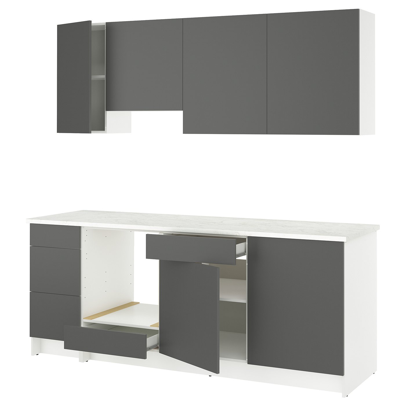 Темно-серые фасады в сочетании с белой столешницей под мрамор придадут вашей кухне современный уютный характер.