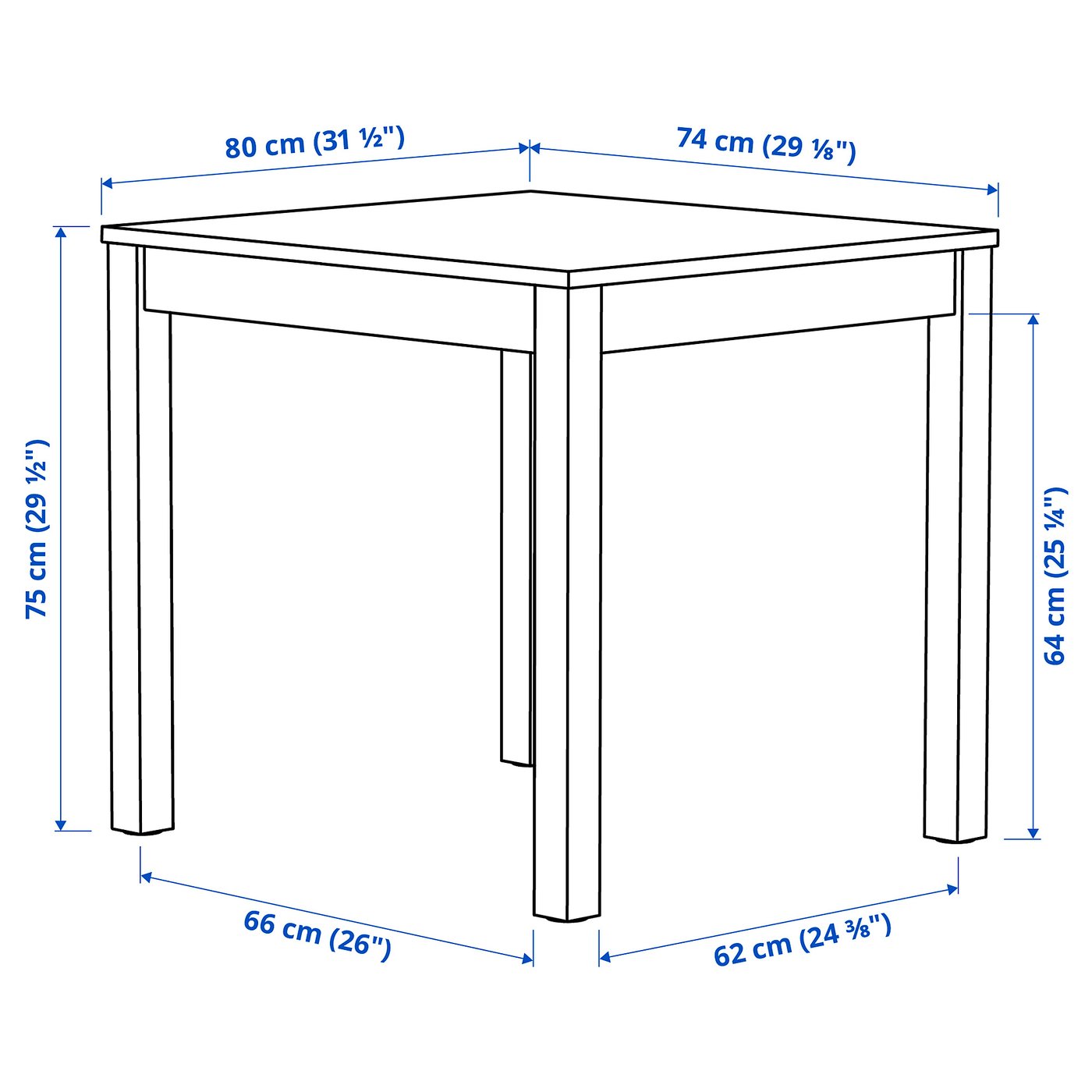 Длина стола: 80 смШирина стола: 74 смВысота стола: 75 смШирина стула: 45 смГлубина стула: 54 смВысота стула: 94 смЭтот продукт может потребовать сборки.