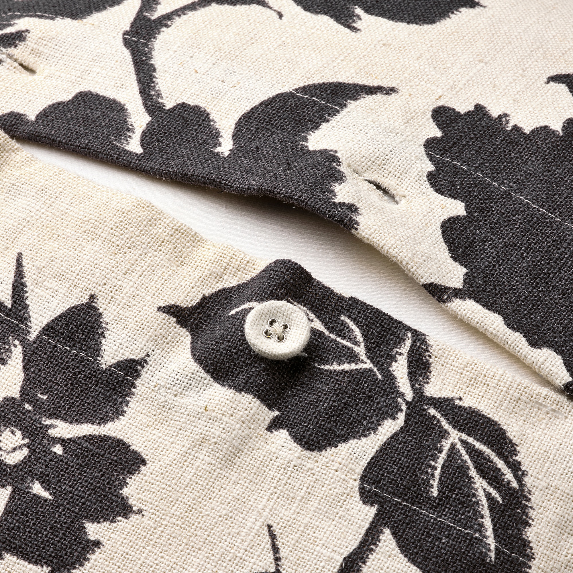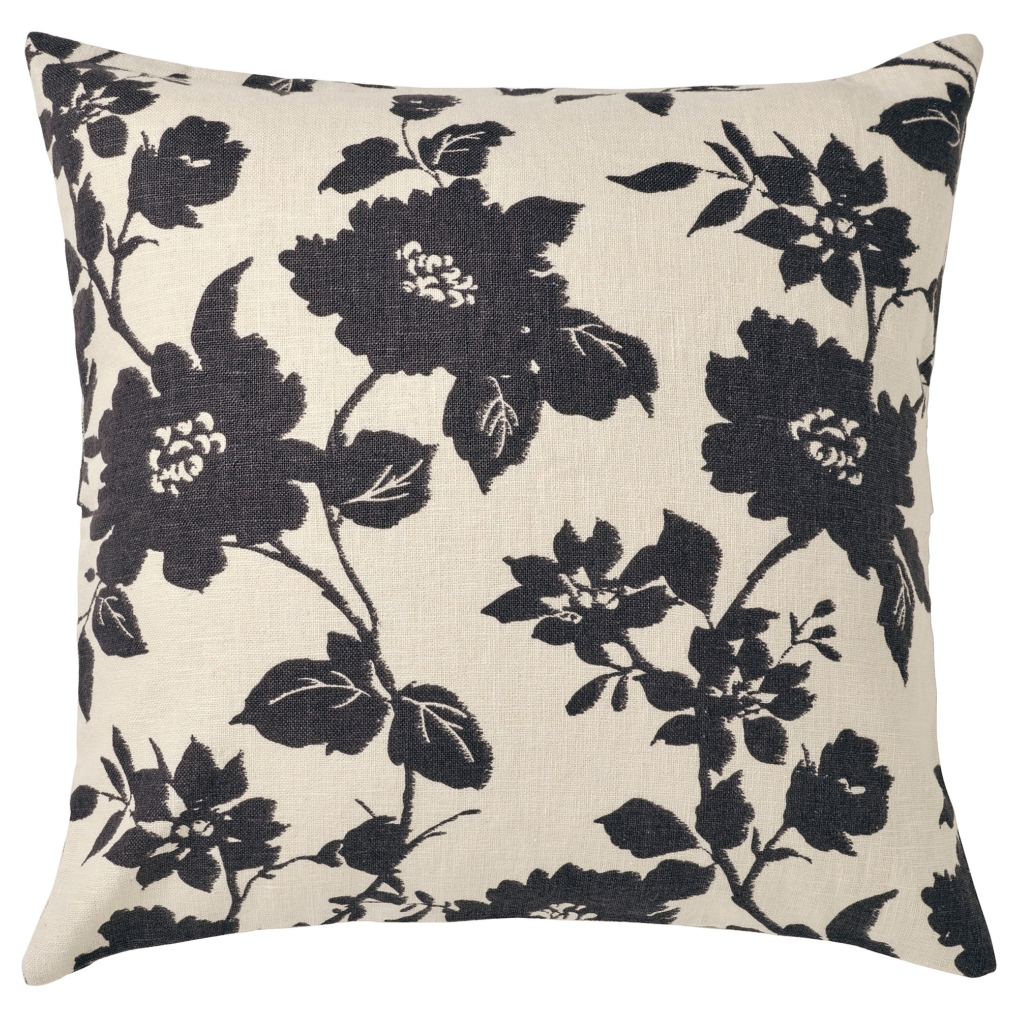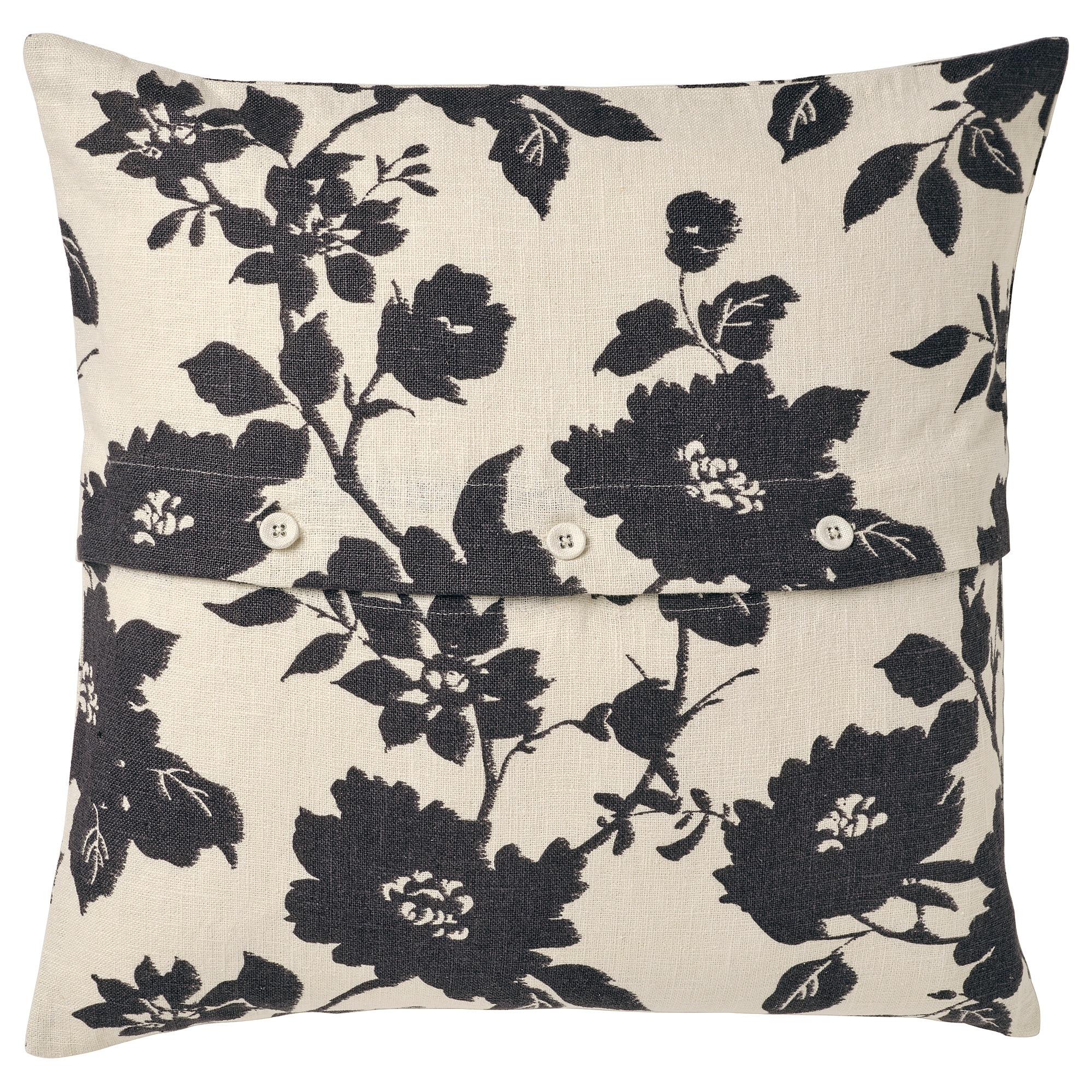 Традиционный цветочный узор яркого антрацитового цвета на неокрашенной ткани рами и декоративная застежка на пуговицы, обтянутые тканью. Чехол на подушку SVÄRDKRISSLA прекрасно сочетается как с однотонными, так и с узорчатыми тканями.