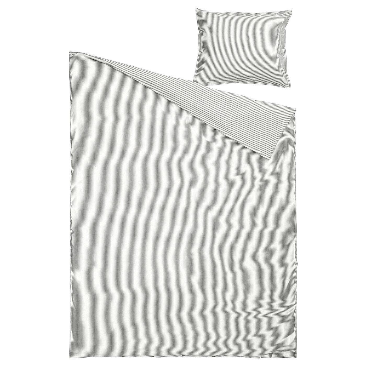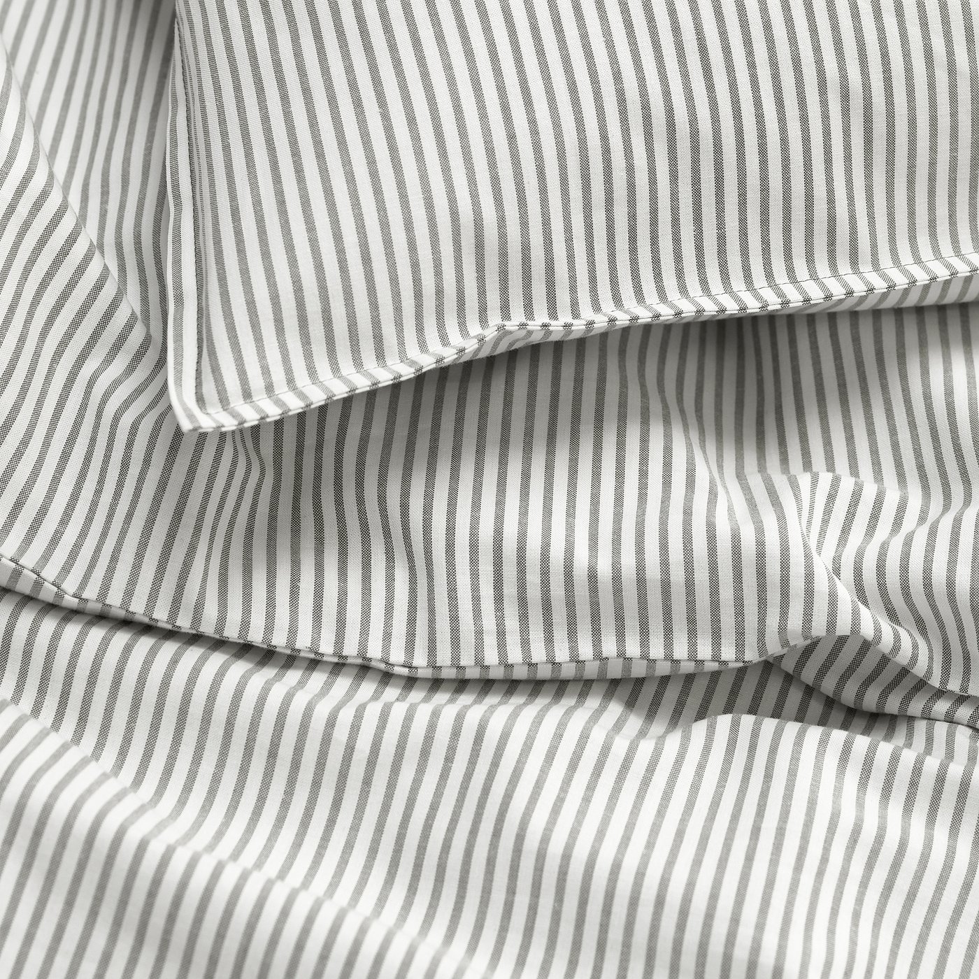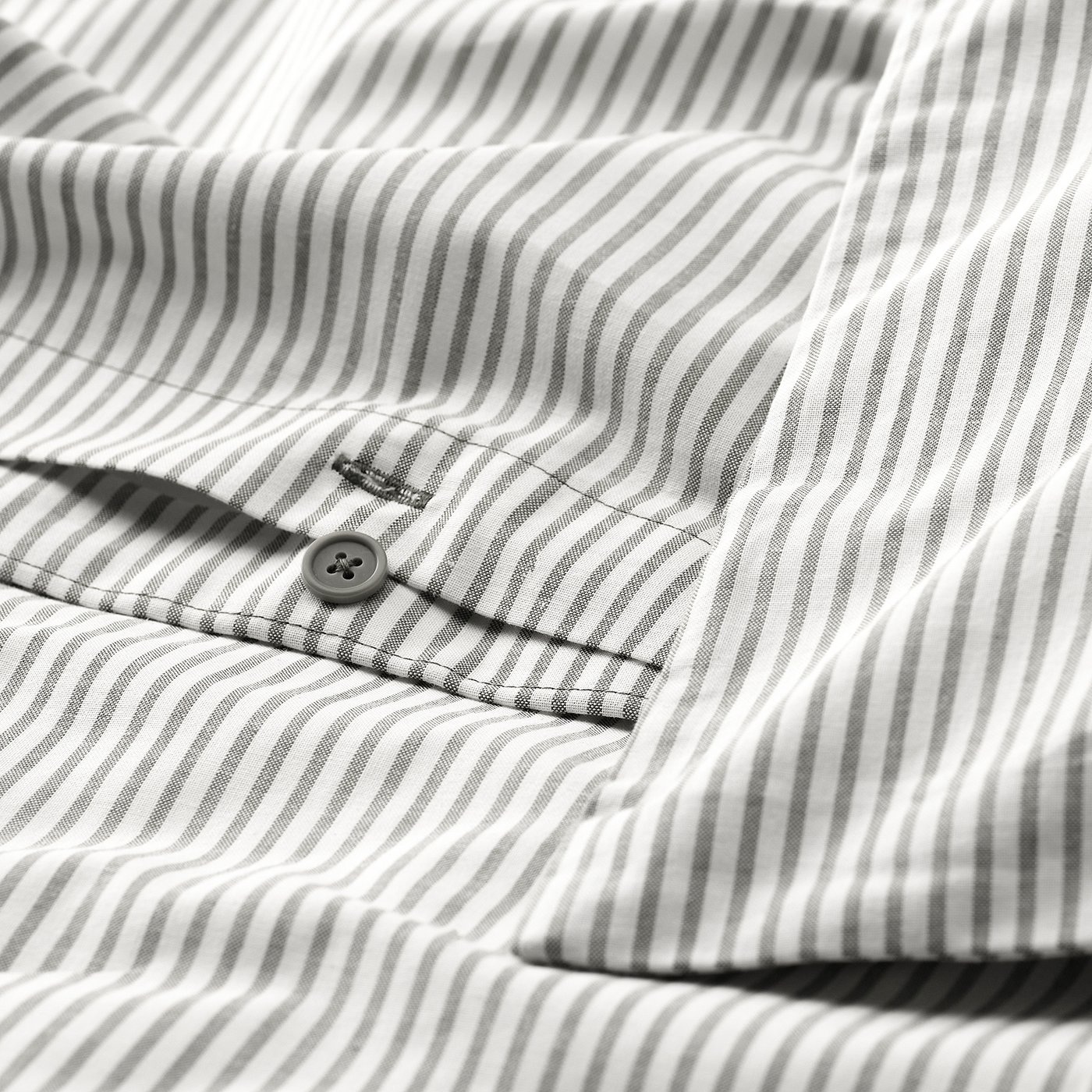 Постельное белье SOLFIBBLA изготовлено из мягкой 100% хлопковой ткани, а окрашенная пряжа образует классические серо-белые полосы. Более толстая пряжа создает в спальне уютную атмосферу с ноткой ремесленного очарования в винтажном стиле.