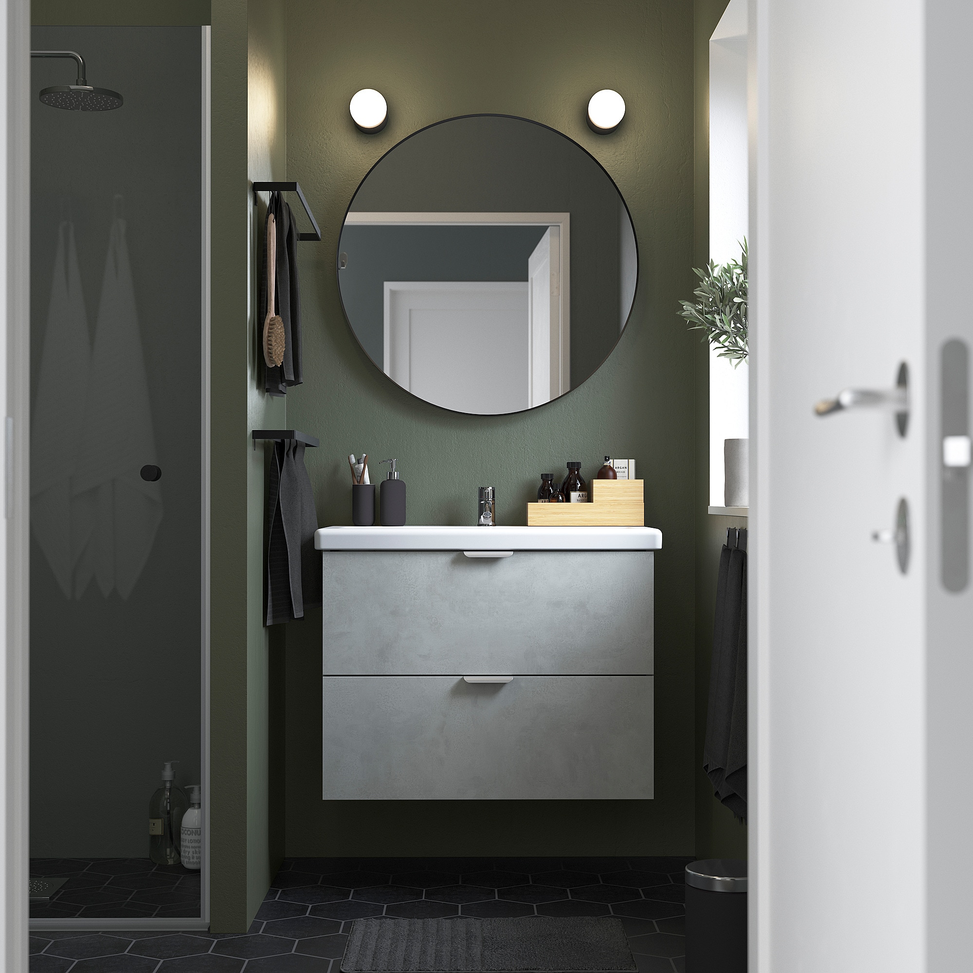 Серия ENHET позволяет легко создать новое решение в ванной комнате. Тумба под умывальник имеет 2 удобных выдвижных ящика для необходимой посуды и фасады, имитирующие бетон, которые придают теплый индустриальный характер.