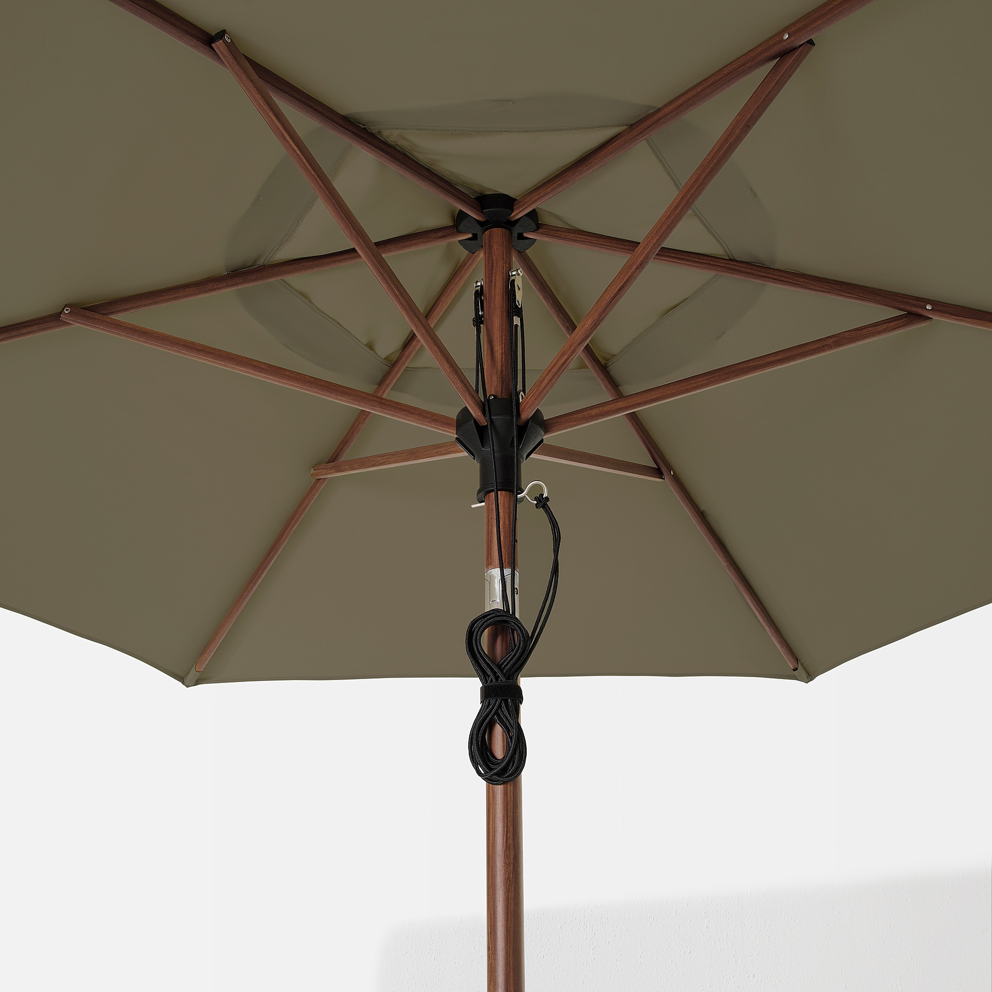 Шнур всегда должен быть свернут и прикреплен к стойке зонта с помощью липучки.