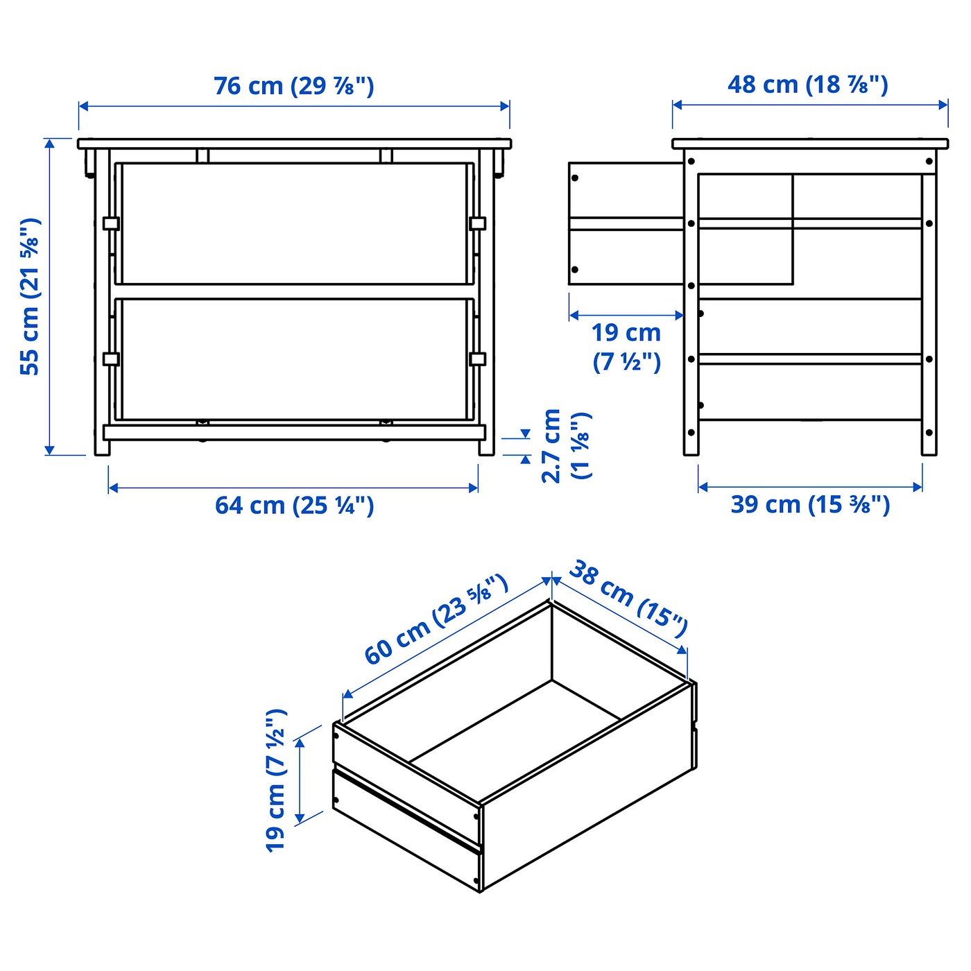 Глубина: 48 смГлубина ящика (внутренняя): 38 смВысота под мебелью: 2.7 смВысота: 55 смЕмкость хранения: 87 лМаксимальная нагрузка/ящик: 7 кгШирина: 76 смШирина ящика (внутренняя): 60 смВыдвижение ящика: 19 смЭтот продукт может потребовать сборки.
