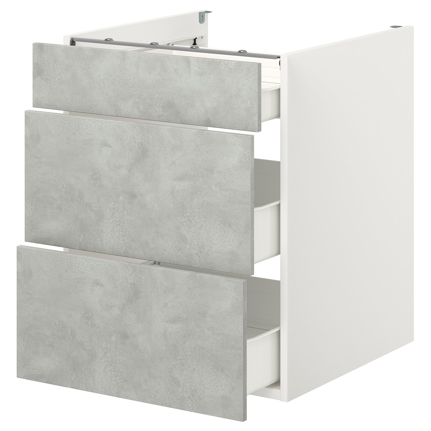 Серия ENHET позволяет легко представить новое решение на кухне. Этот шкаф имеет 3 удобных ящика для кастрюль и кухонной утвари, а фасады, имитирующие бетон, придают ему теплый индустриальный характер.