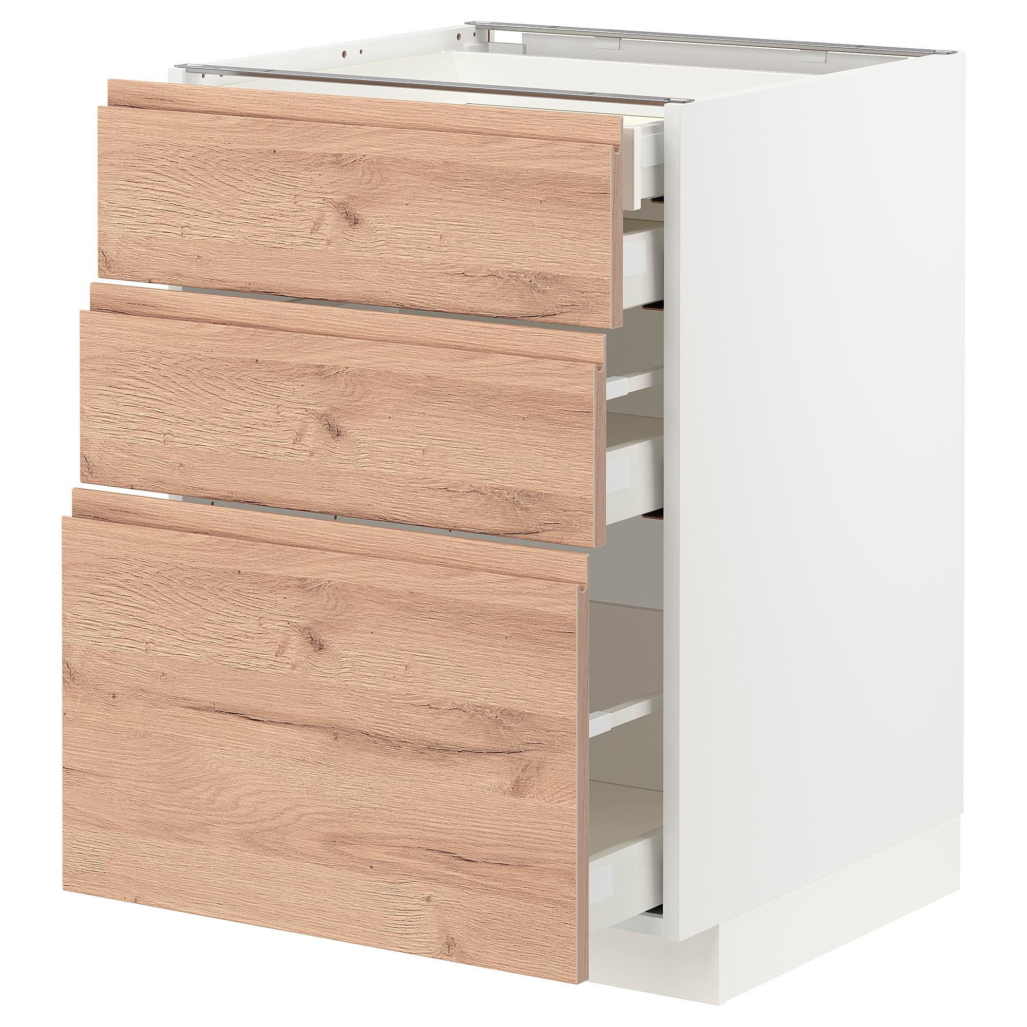 Система METOD предлагает неограниченные возможности для дизайна кухни вашей мечты. В сочетании с фасадами VOXTORP из имитации дуба со встроенными ручками вы получите естественный, теплый вид.