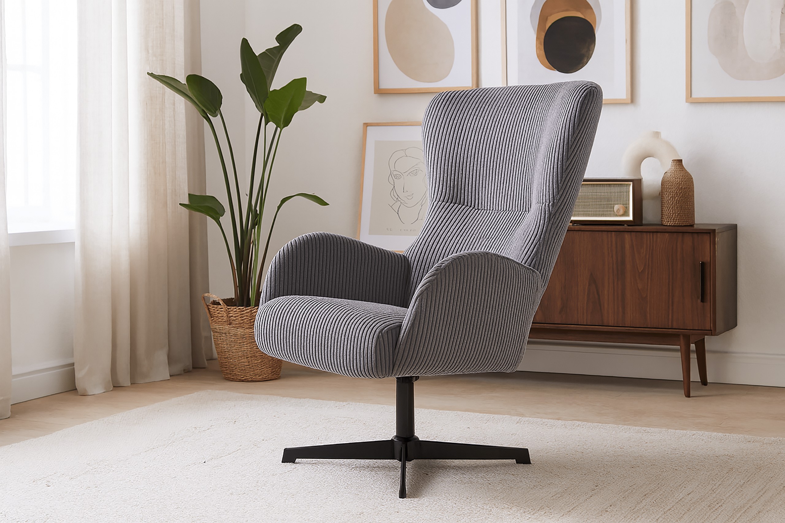 Мягкая вельветовая ткань с приятной текстурой в модном темно-сером оттенке придает интерьеру уют и стильный шарм, прекрасно вписываясь в современные тенденции дизайна.