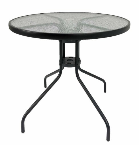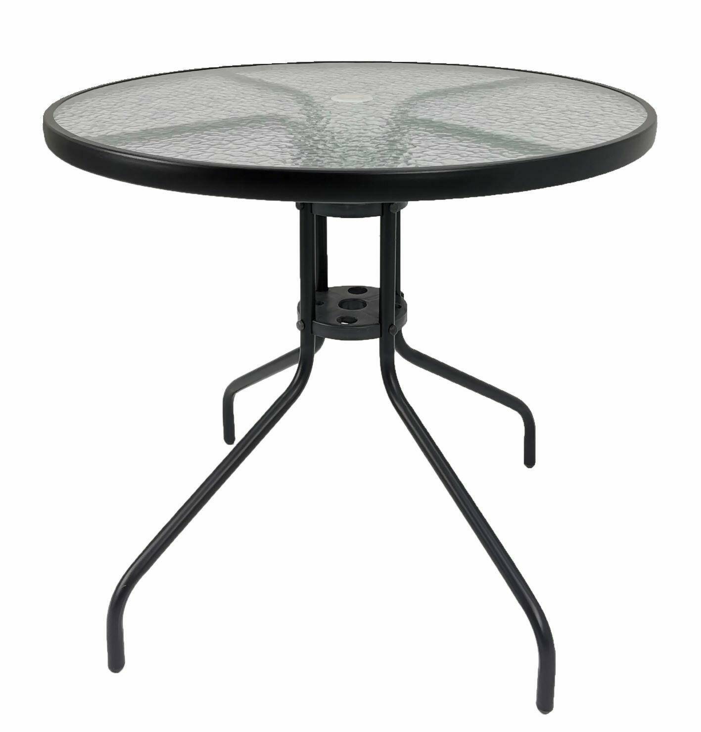 Кофейный столик BERGAMO черного цвета — это стильное и функциональное дополнение к саду или террасе. Круглая столешница диаметром 90 см изготовлена из прочного закаленного стекла с узором в виде волнистой воды, что придает столику элегантный и современный вид.