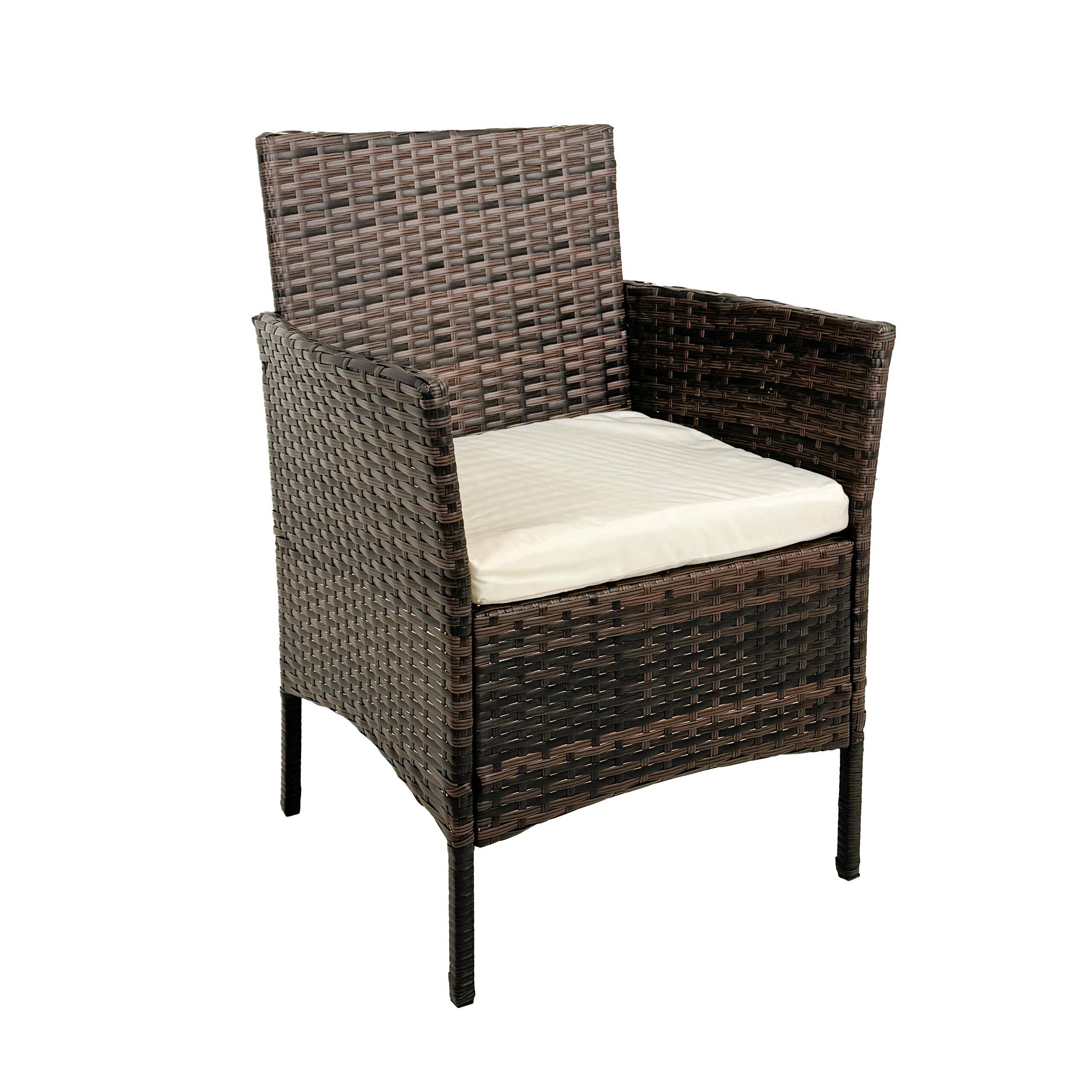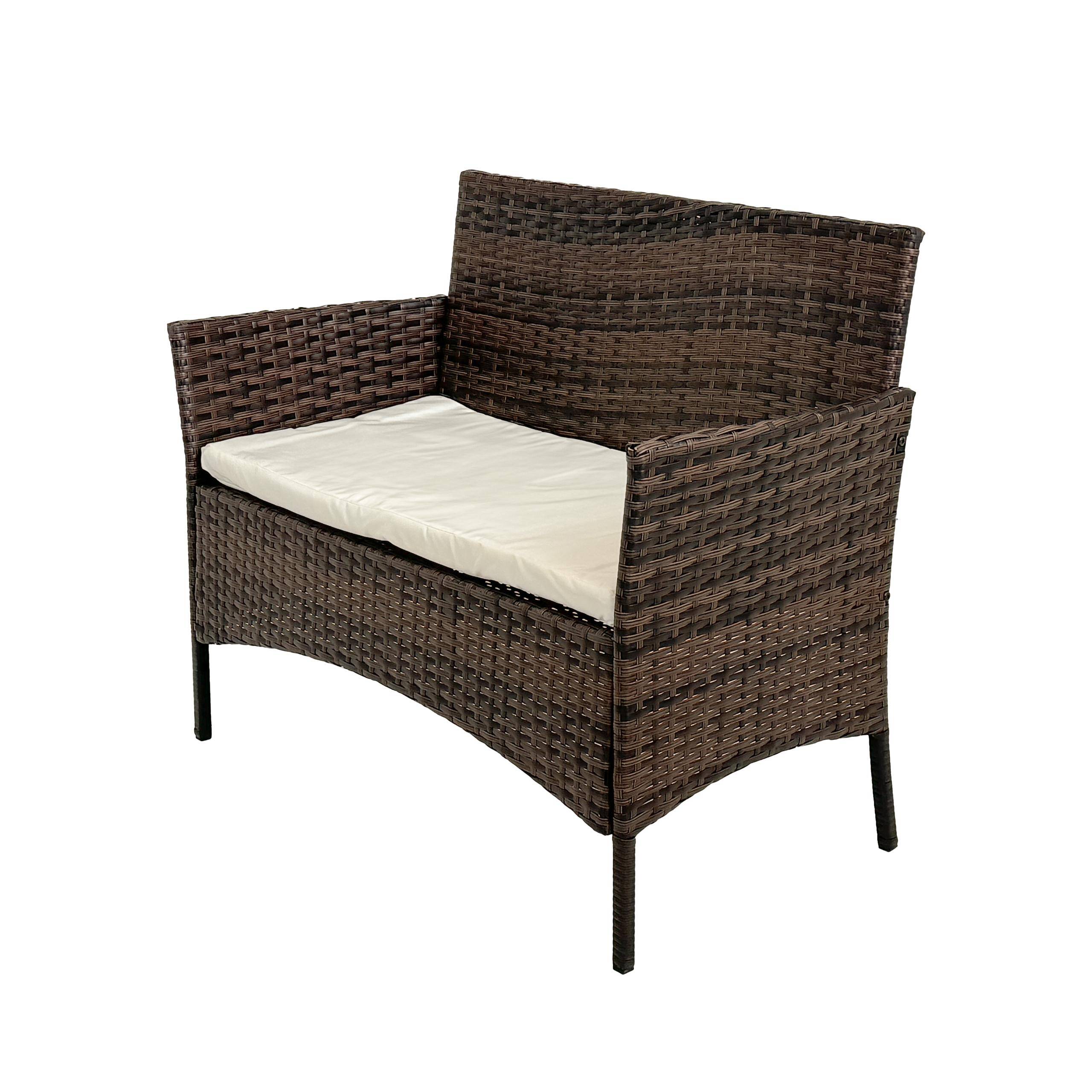 Материал — техноротан РАЗМЕРЫ:1*СКАМЕЙКА: 102 x 55 x 82 см — сиденье из полиэстера плотностью 180 г 2*КРЕСЛО: 59 x 55 x 82 см — сиденье из полиэстера плотностью 180 г 1*СТОЛ: 71 x 41 x 39 см — столешница из закаленного стекла, каркас из сталикоробка — 97 × 32 × 55