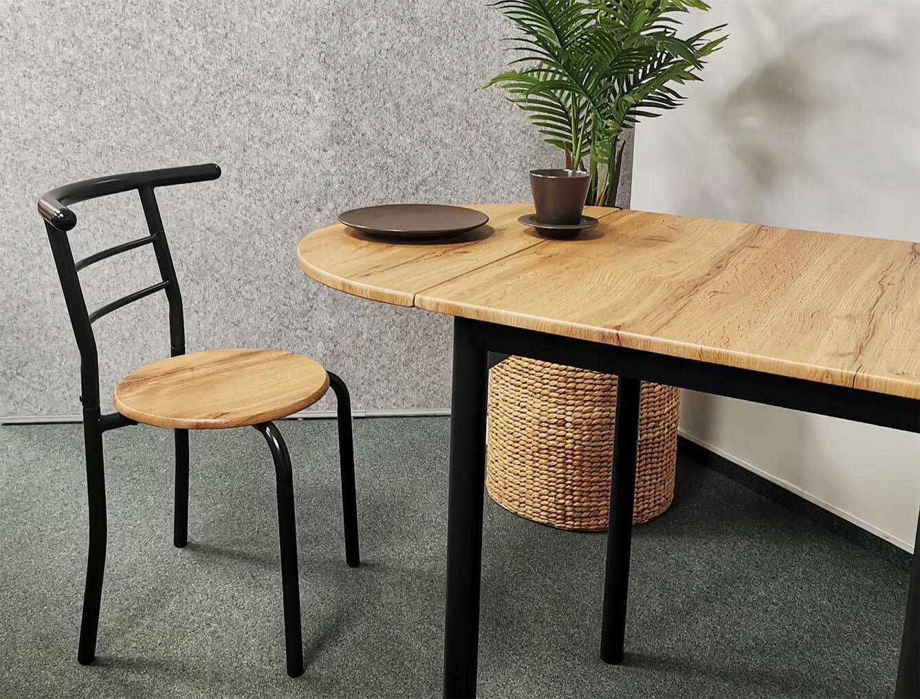 Современное и в то же время удобное ✔️ Каркас стула изготовлен из прочной стали с порошковым покрытием. ✔️ Сиденье изготовлено из МДФ толщиной 1,5 см с отделкой под дуб, что придает ему теплоту и естественный акцент. ✔️ Ножки стула представляют собой устойчивую металлическую конструкцию черного цвета, что подчеркивает современный стиль мебели. ✔️ Стул не требует сложного ухода — достаточно мягкой салфетки, воды или жидкости для мытья посуды, чтобы поддерживать его в отличном состоянии на протяжении многих лет.