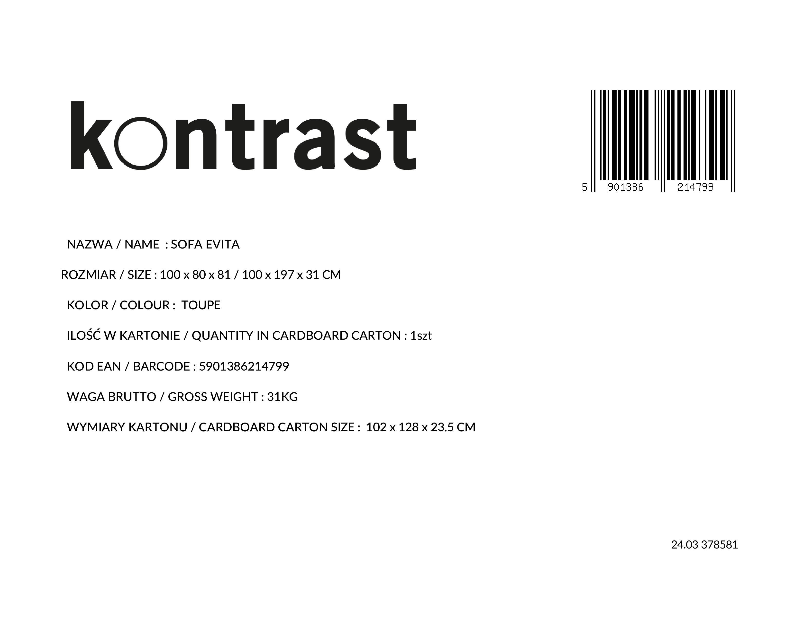 Раскладной диван EVITA TAUPE – идеальное решение для любой гостиной или комнаты, где требуется простая и функциональная мебель. Благодаря современному дизайну и эргономичным решениям диван сочетает в себе удобство и стиль.
