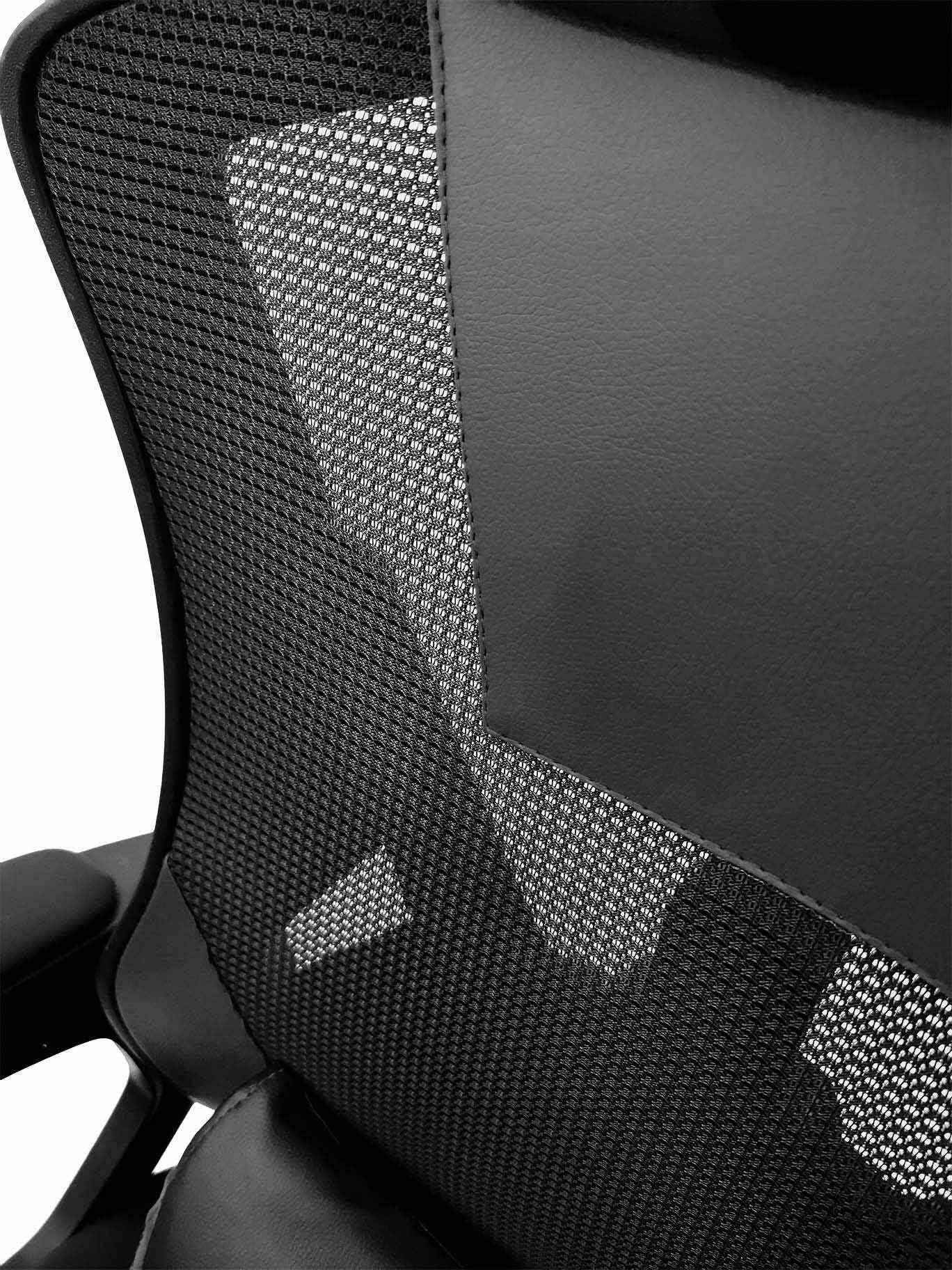 Игровое кресло KG100 обтянуто экокожей и сеткой, что обеспечивает как эстетичный вид, так и практичность. Материалы устойчивы к загрязнениям, а дышащая сетка на спинке предотвращает перегрев спины, обеспечивая дополнительный комфорт при длительном сидении.