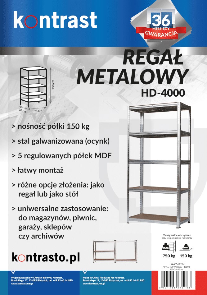 Металлический стеллаж Kontrast HD4000 — это функциональное и прочное решение, которое отлично подойдет для использования в различных помещениях, таких как гараж, подвал, склад, магазин или архив. Благодаря прочной конструкции из оцинкованной стали и полкам из МДФ толщиной 4 мм стеллаж идеально подходит для хранения самых разных предметов, даже имеющих большой вес. Максимальная нагрузка на одну полку составляет целых 150 кг, что обеспечивает общую грузоподъемность стеллажа до 750 кг.
