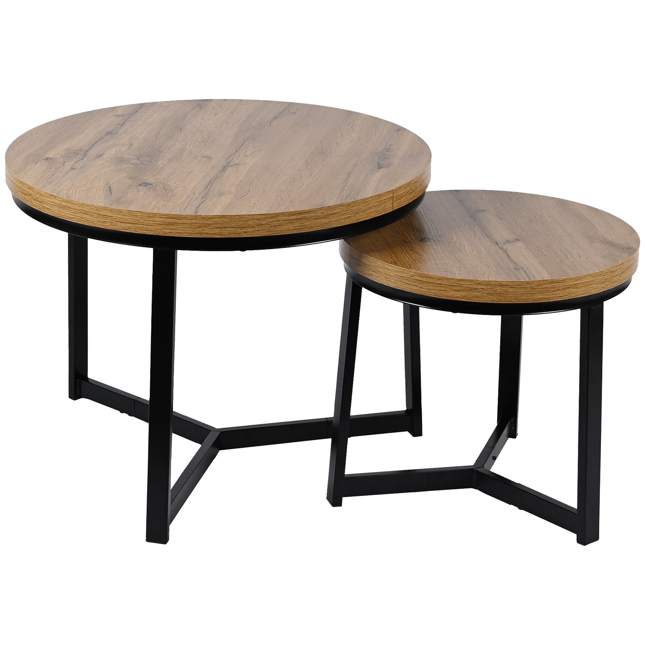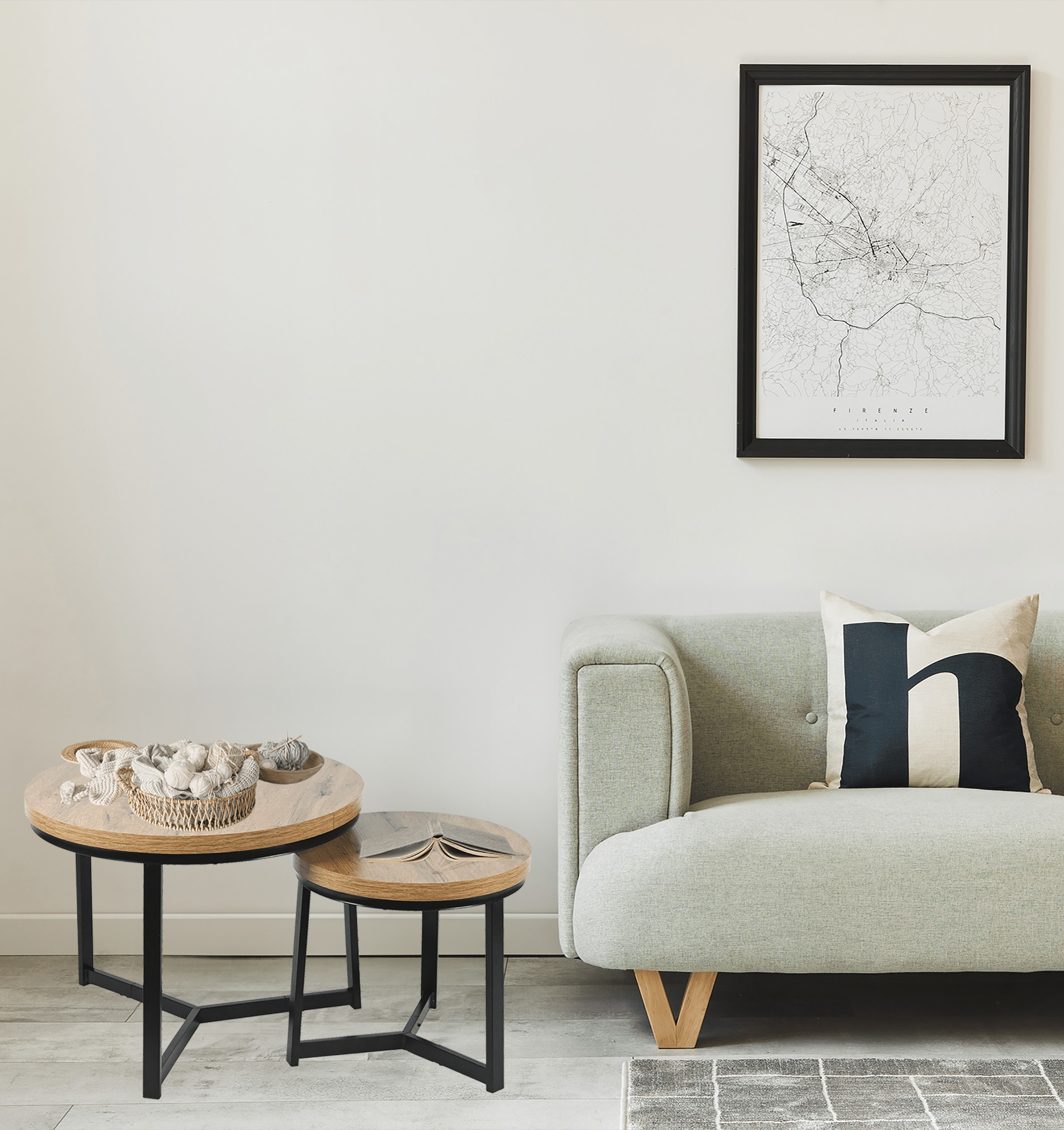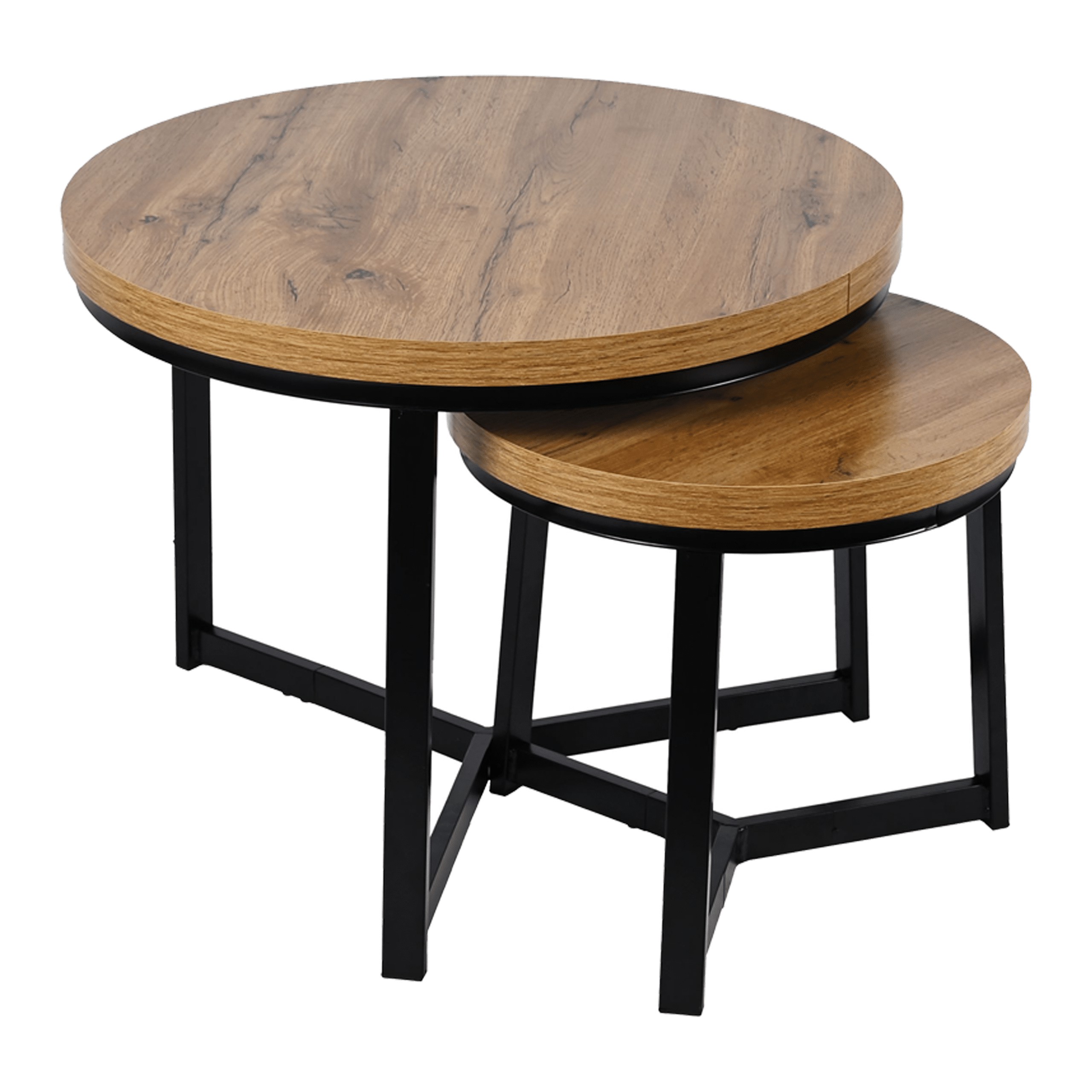 Благодаря прочным материалам, таким как МДФ под дуб, и устойчивым стальным ножкам черного цвета, набор отличается прочной конструкцией и устойчивостью к повседневной эксплуатации. Этот круглый столик идеально вписывается в интерьеры в скандинавском и индустриальном стилях, благодаря чему он подойдет как для современной гостиной, так и для более минималистичных пространств.