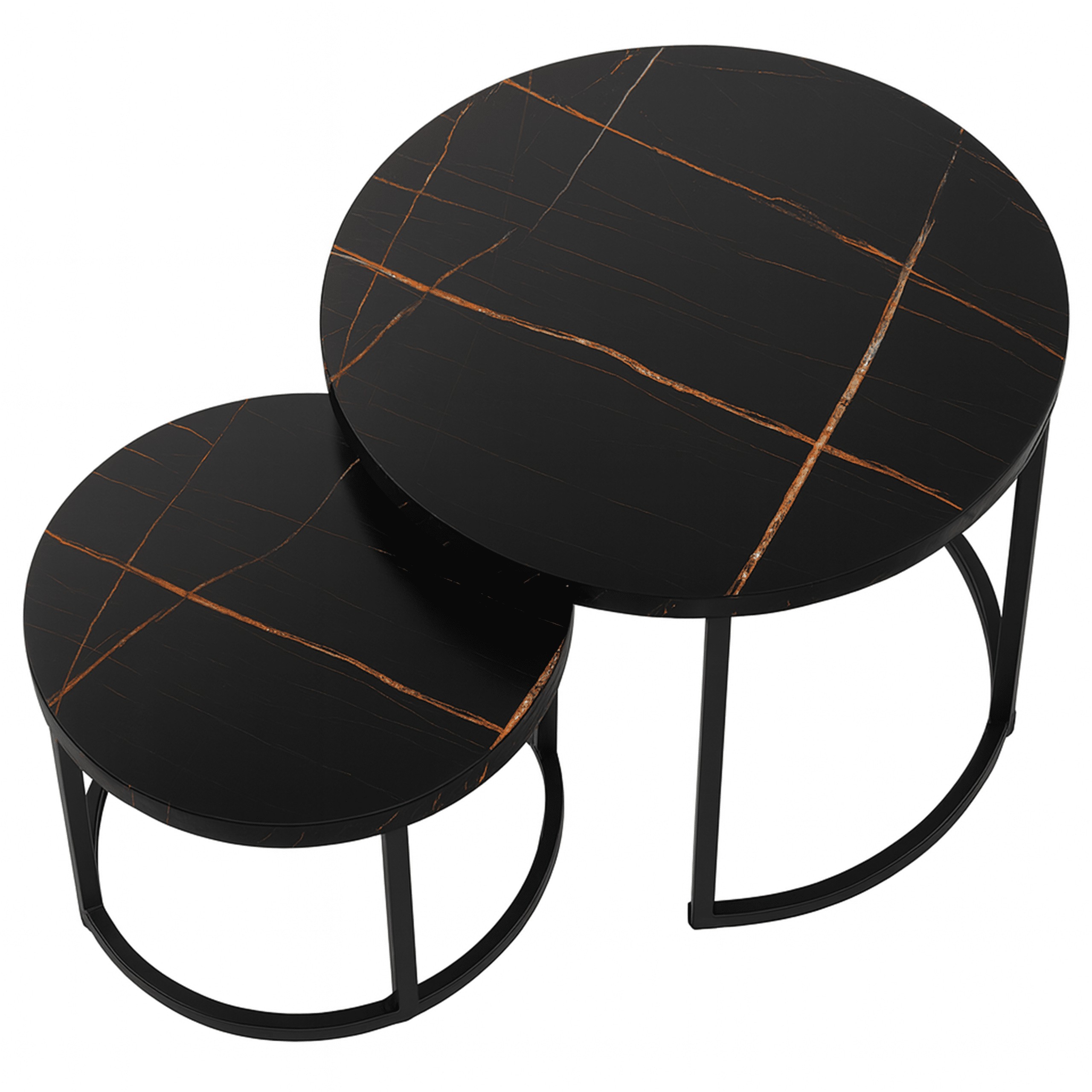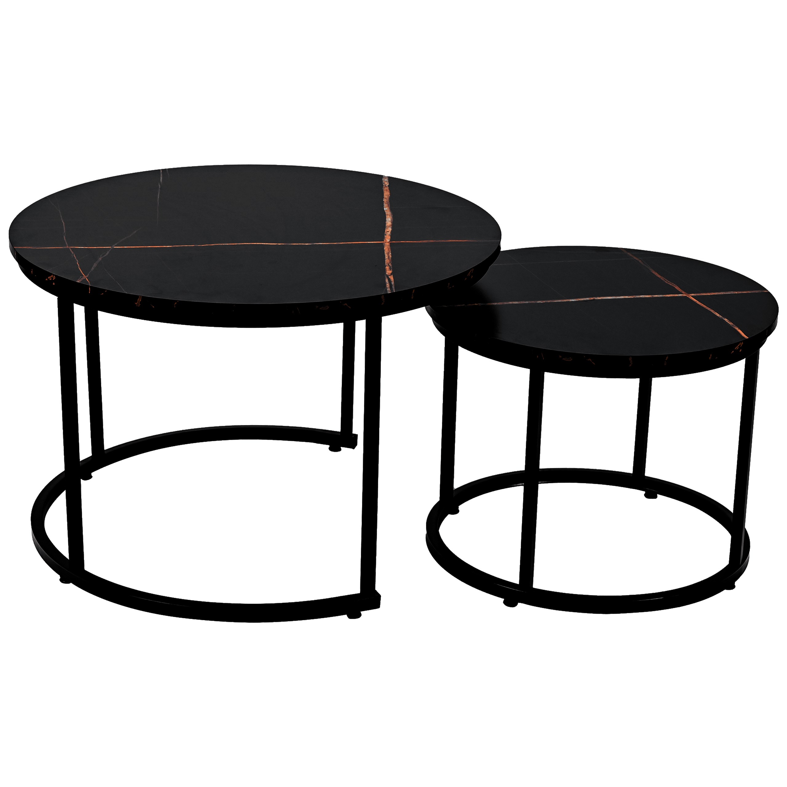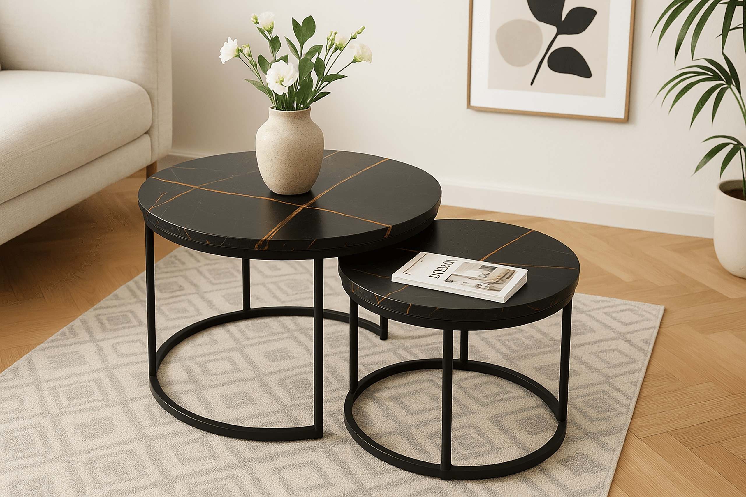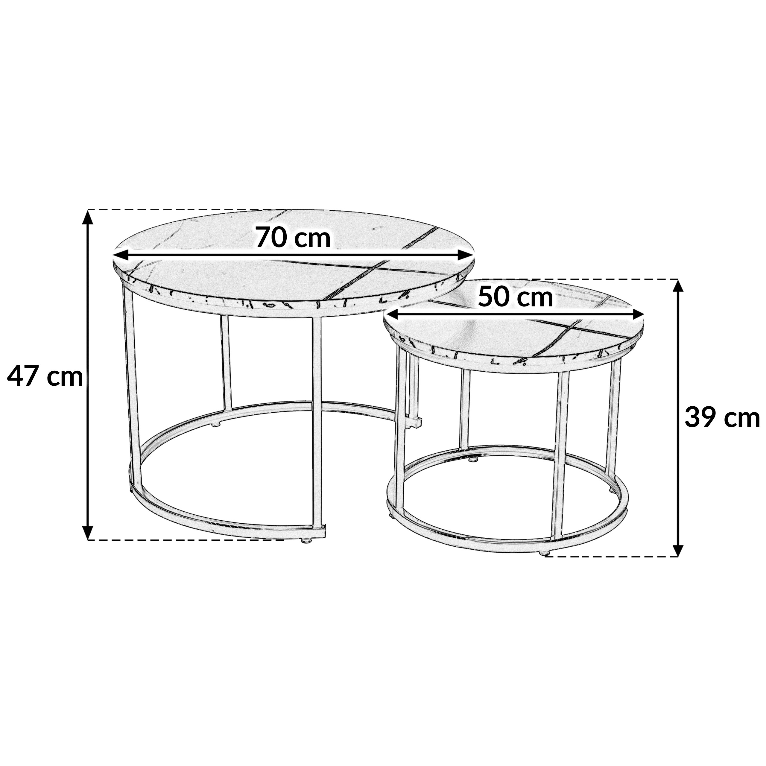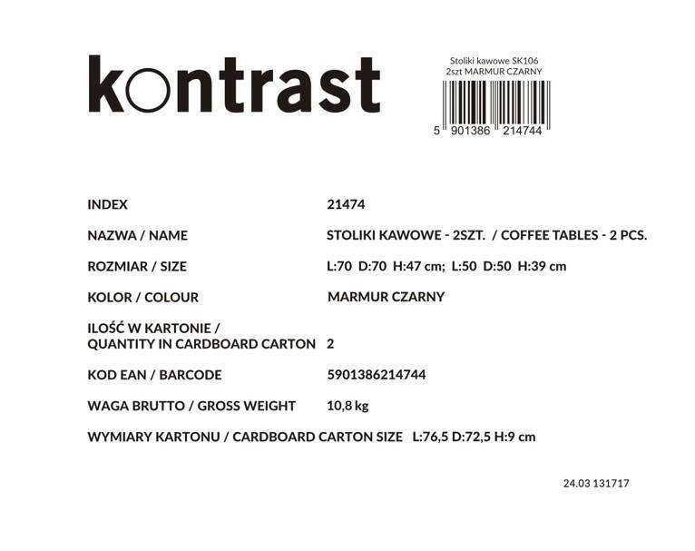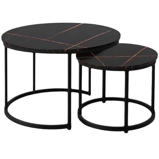 Набор из двух круглых журнальных столиков SK106MCZ – идеальный выбор для тех, кто желает дополнить свой интерьер элегантным и функциональным предметом. Эти стильные столики с столешницами под черный мрамор и стальной рамой с порошковым покрытием прекрасно впишутся в интерьеры в стиле индастриал и модерн, придав помещению нотку роскоши и современности. Благодаря усиленной конструкции и практичной возможности задвигать меньший столик под больший, этот набор станет отличным решением для любой гостиной, гостиной-гостиной или спальни.