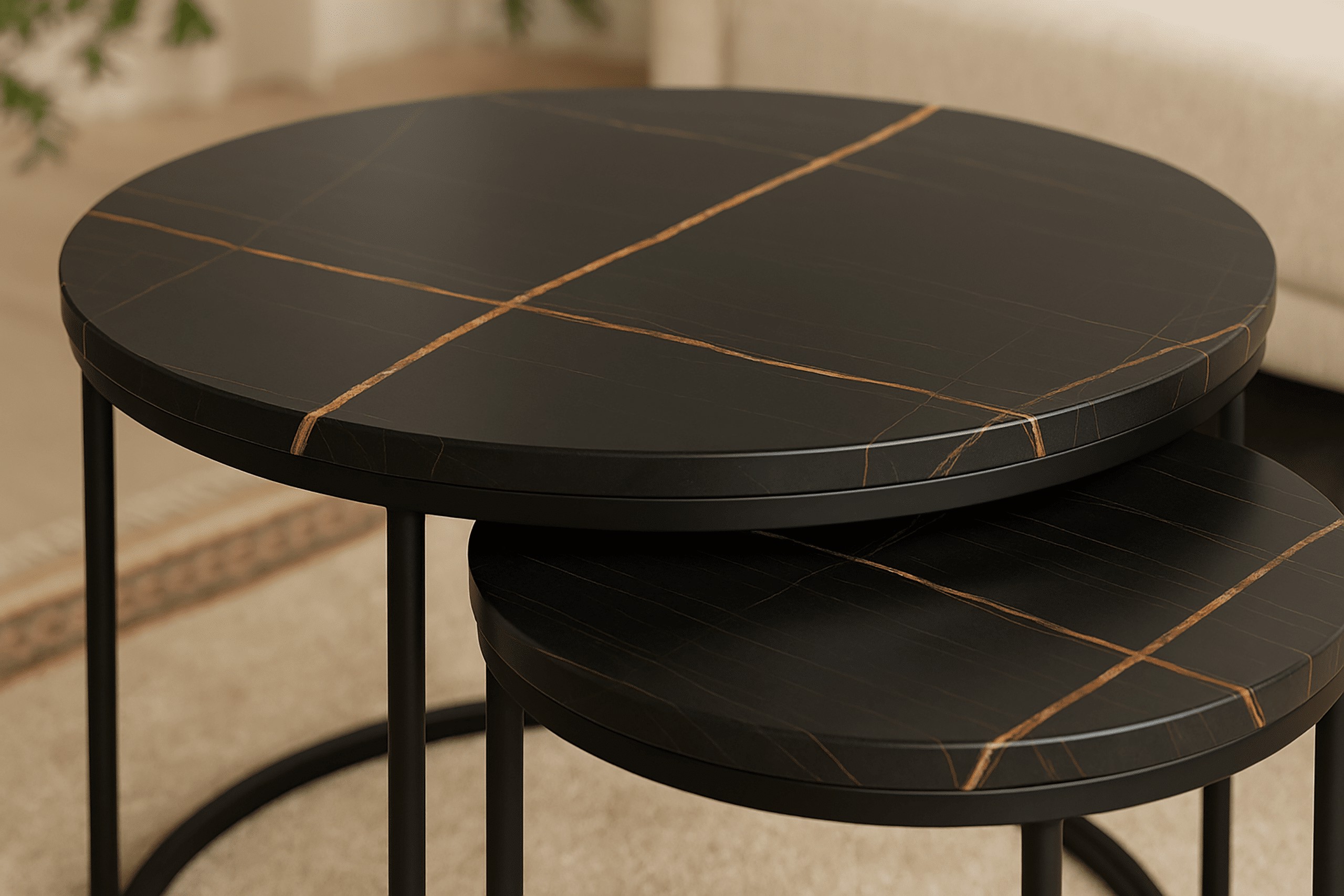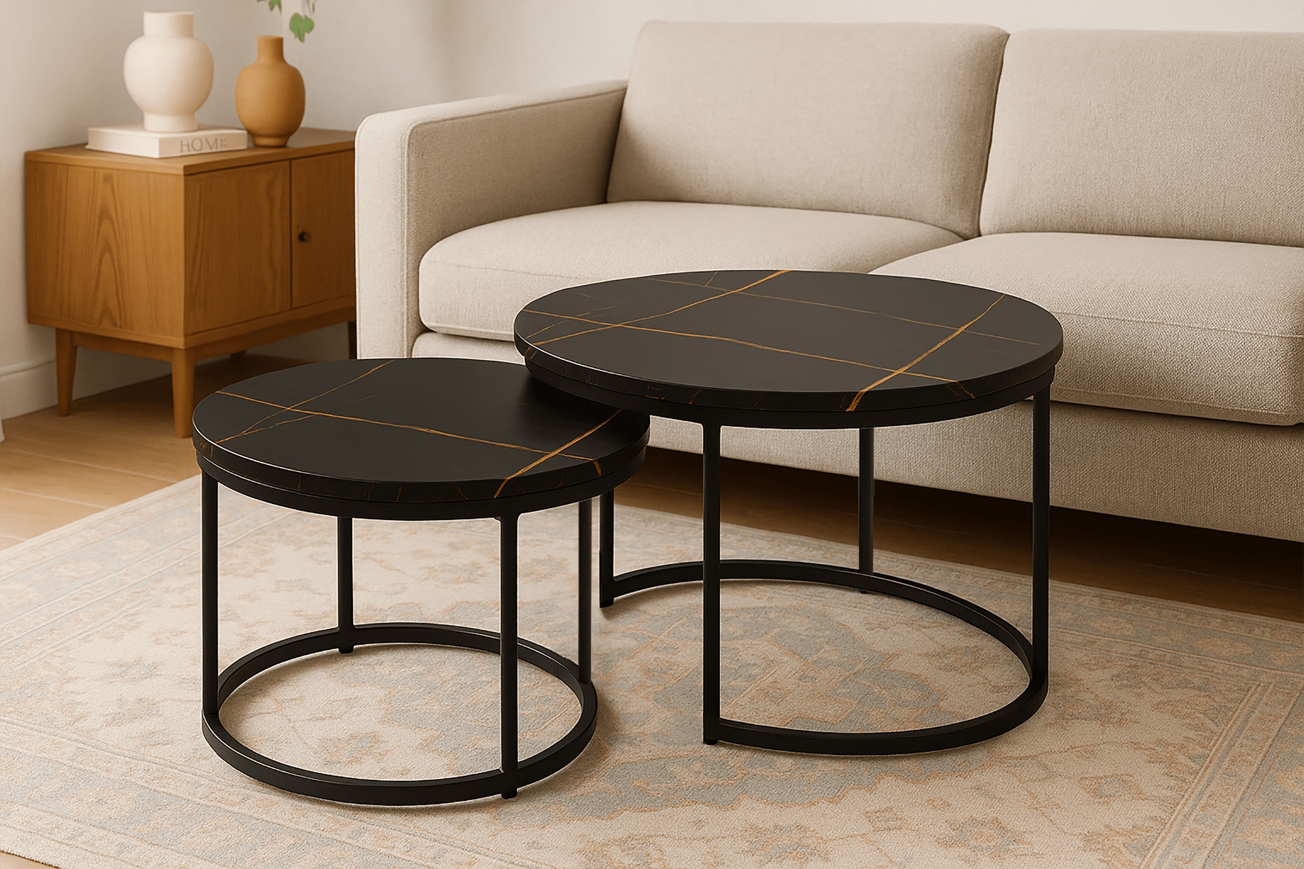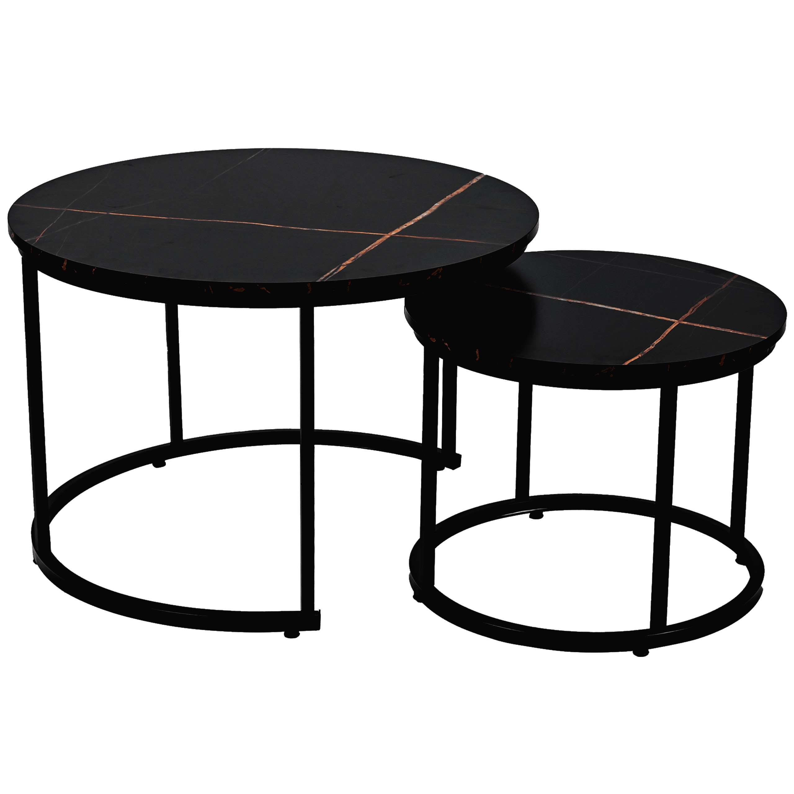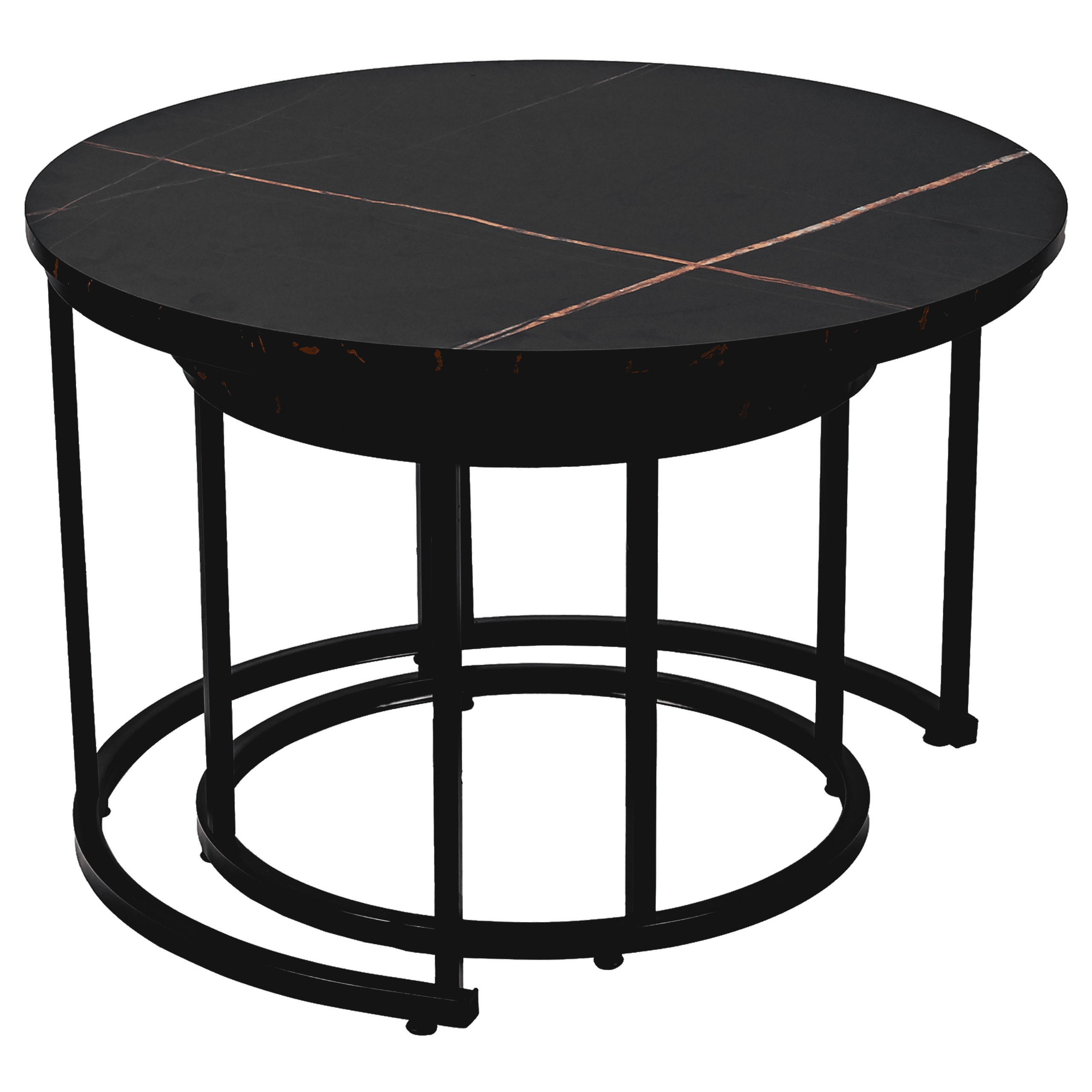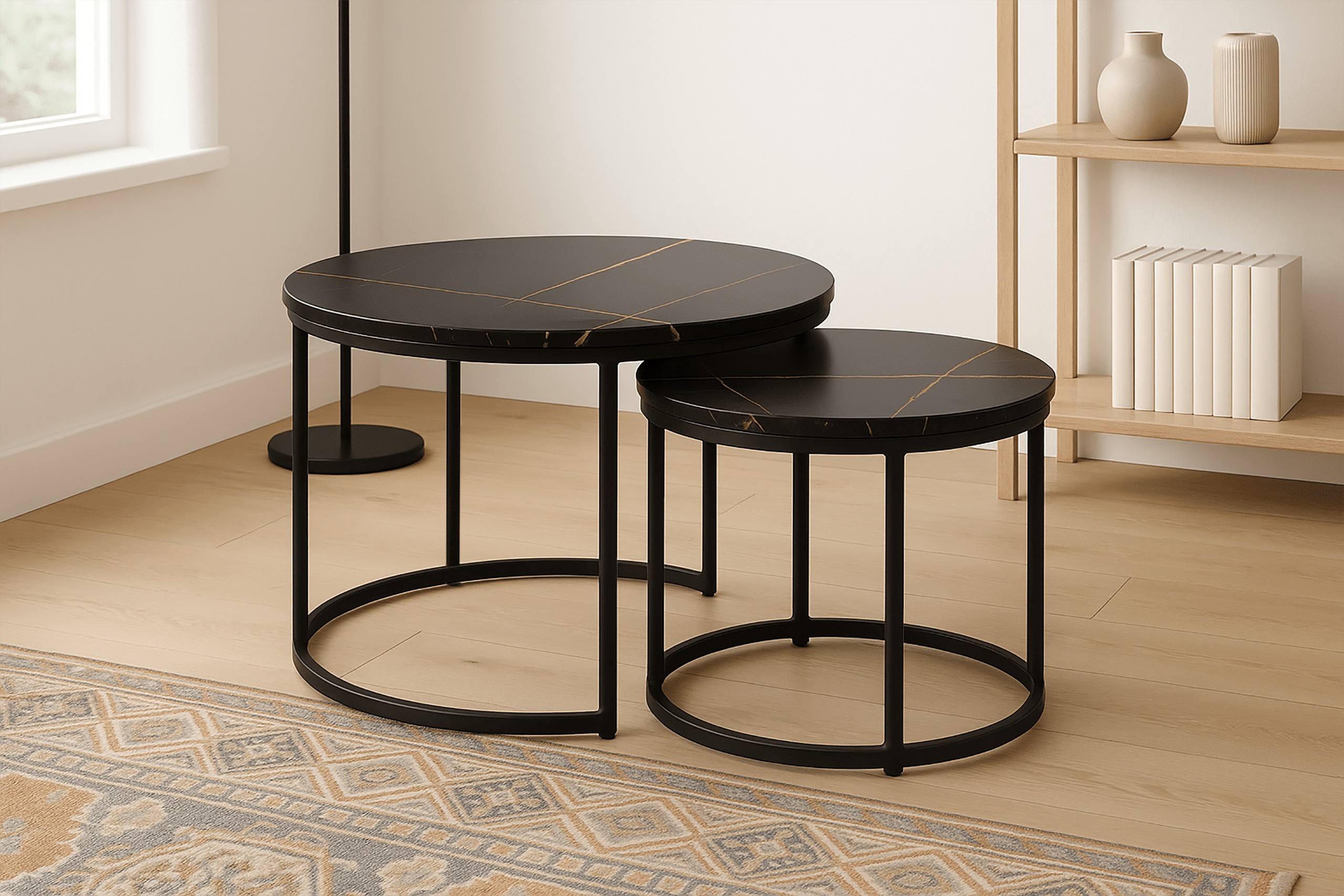 Набор из двух круглых журнальных столиков SK106MCZ – идеальный выбор для тех, кто желает дополнить свой интерьер элегантным и функциональным предметом. Эти стильные столики с столешницами под черный мрамор и стальной рамой с порошковым покрытием прекрасно впишутся в интерьеры в стиле индастриал и модерн, придав помещению нотку роскоши и современности. Благодаря усиленной конструкции и практичной возможности задвигать меньший столик под больший, этот набор станет отличным решением для любой гостиной, гостиной-гостиной или спальни.