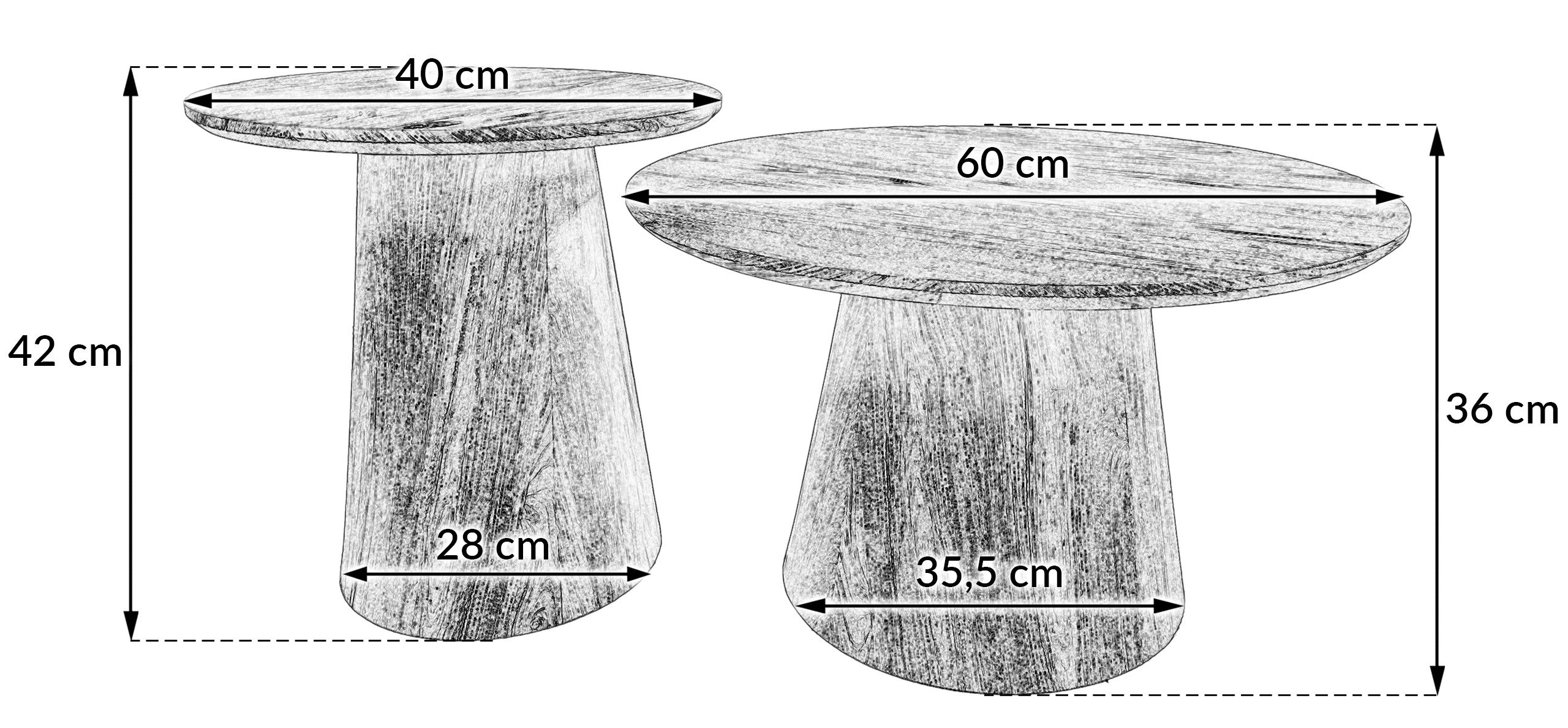 Размеры меньшего столика: Диаметр столешницы: 40 см Толщина столешницы: 18 мм Высота стола: 42 см Диаметр основания: 17/27 см Размеры большего столика: Диаметр столешницы: 60 см Толщина столешницы: 18 мм Высота стола: 36 см Диаметр основания: 23/35 см Упаковка: 2 столешницы — картонная коробка 67x66x10 мм Основание меньшего столика — картонная коробка 33x33x47 см Основание большего столика — картонная коробка 41x41x41 см