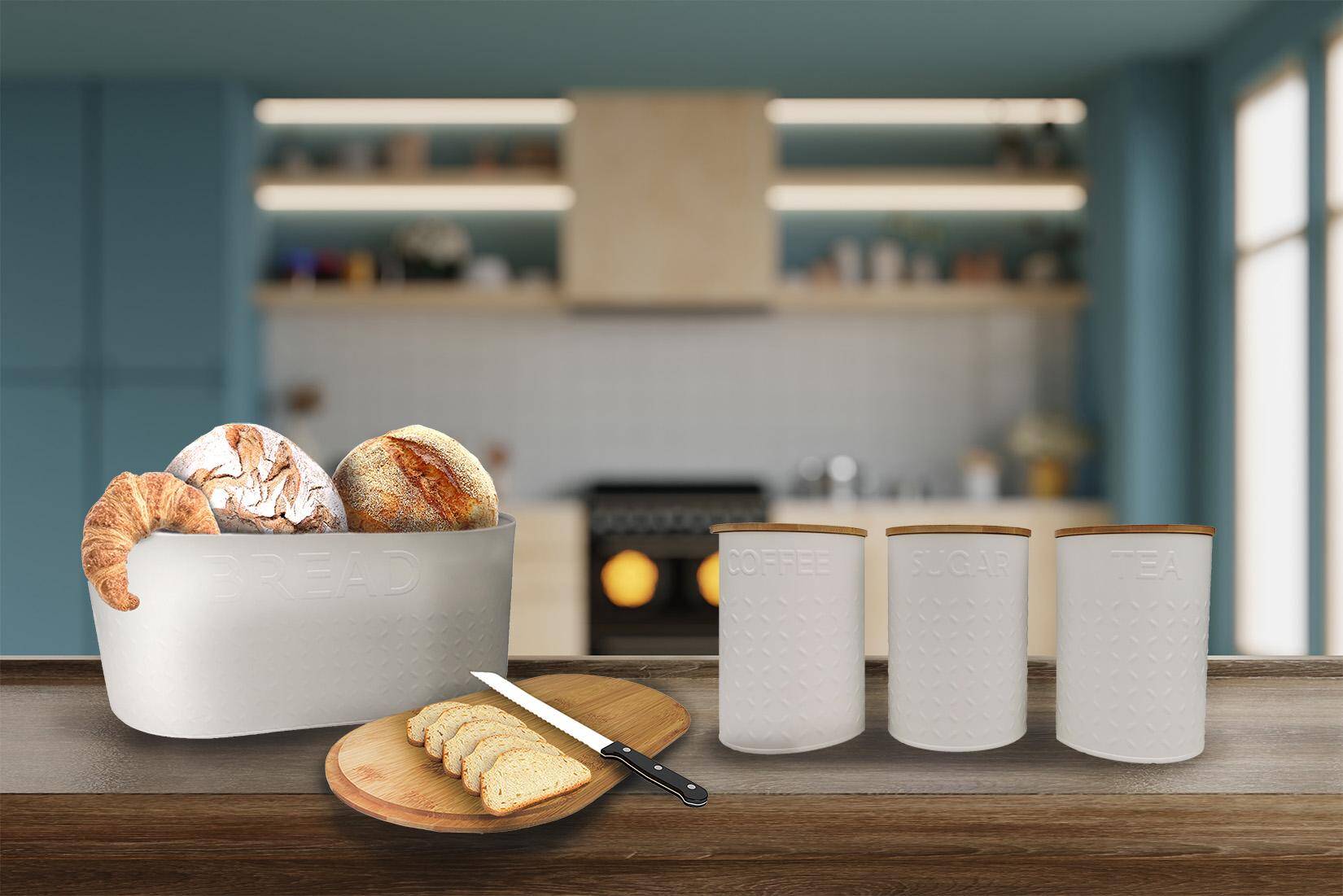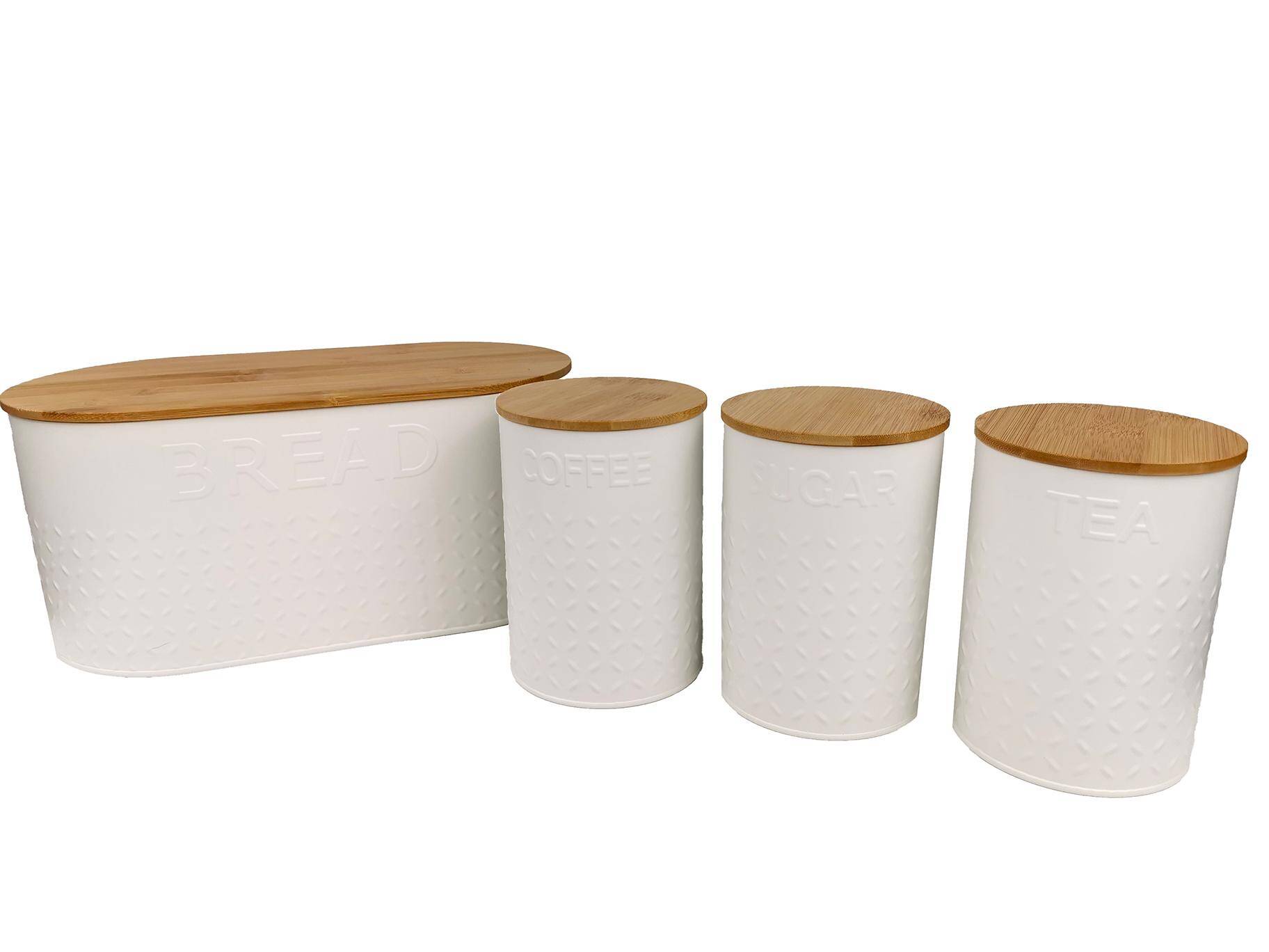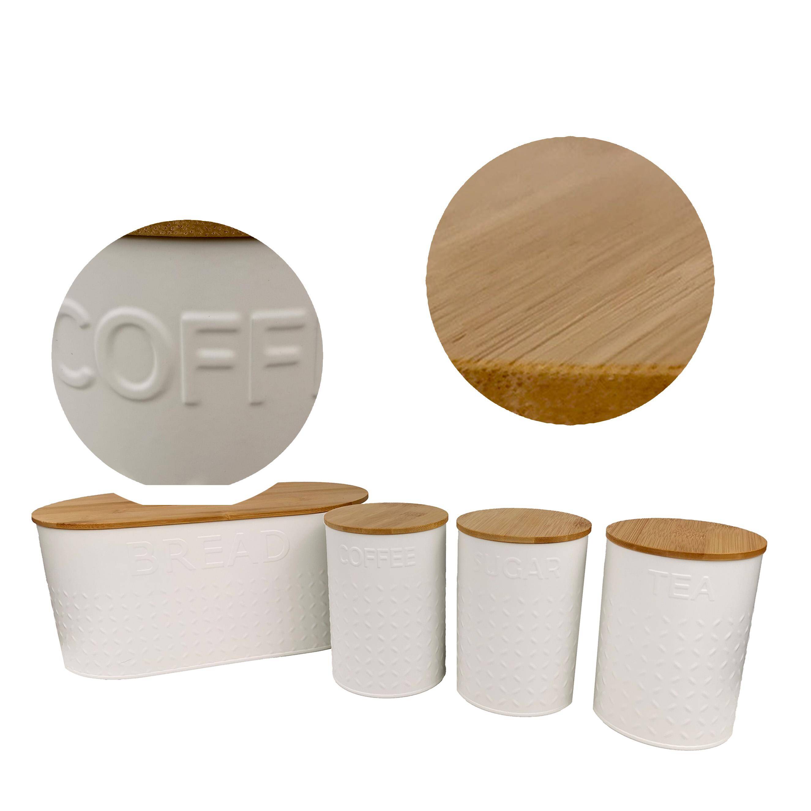 Элегантный кухонный набор WZ04 белого цвета — это сочетание стиля, функциональности и долговечности. Он состоит из практичной хлебницы и контейнеров для кофе, сахара и чая. Все элементы изготовлены из порошковой стали и бамбукового дерева, что гарантирует прочность и эстетичный вид.