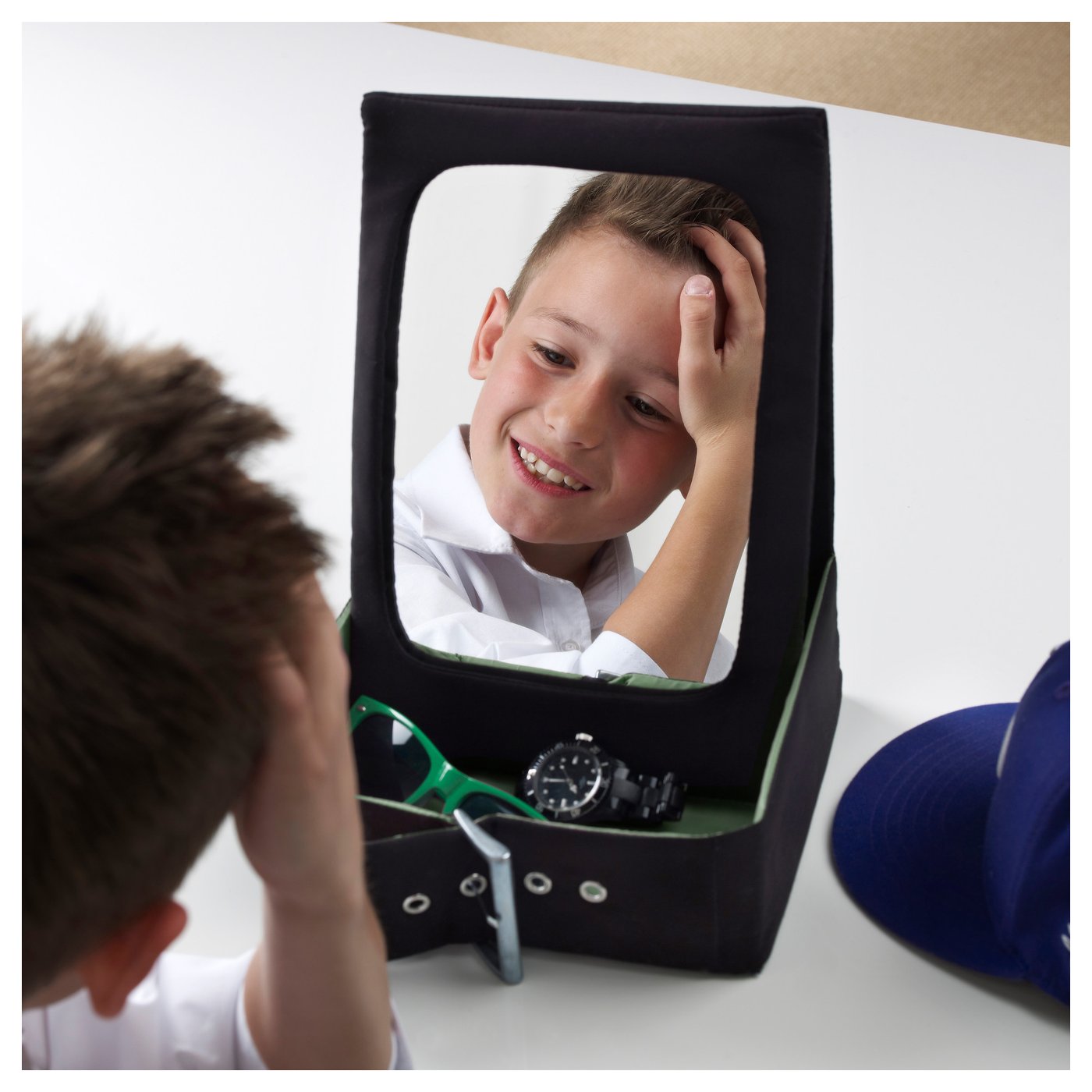 Настольное зеркало с практичным отделением для хранения украшений и аксессуаров для волос. Можно сложить, что обеспечивает комфортное хранение. Простой уход.