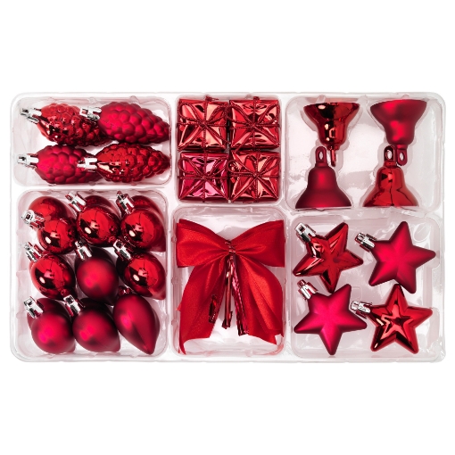 В набор входит: 4 звездочки (высота 5 см), 4 шишки (высота 6 см), 4 колокольчика (высота 4 см), 4 свертка (высота 3 см), 9 сердечек (высота 5 см) и 4 бантика (высота 7 см).